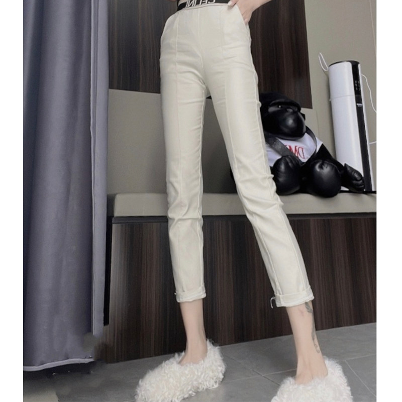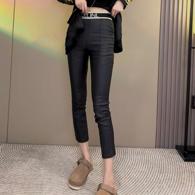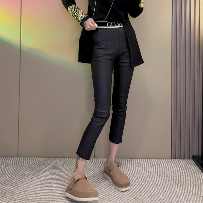 欧货秋冬新款字母腰加绒涂层裤女松紧腰弹力百搭小脚裤修身直筒裤