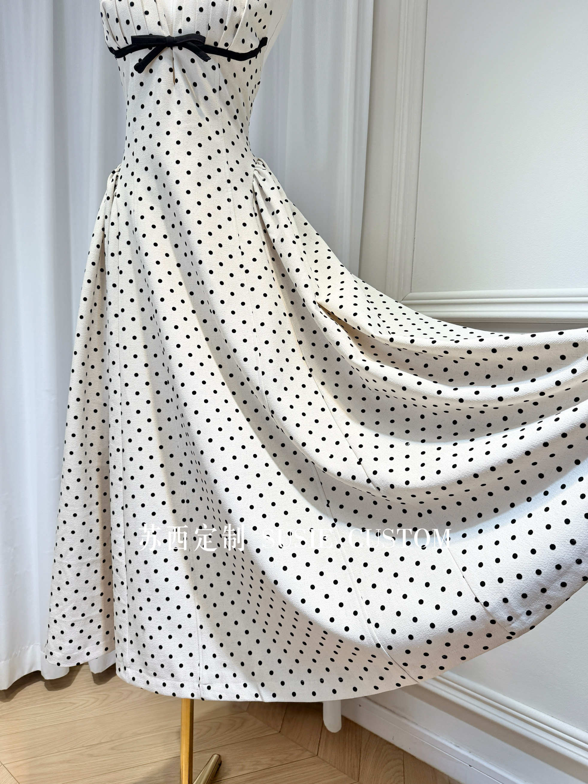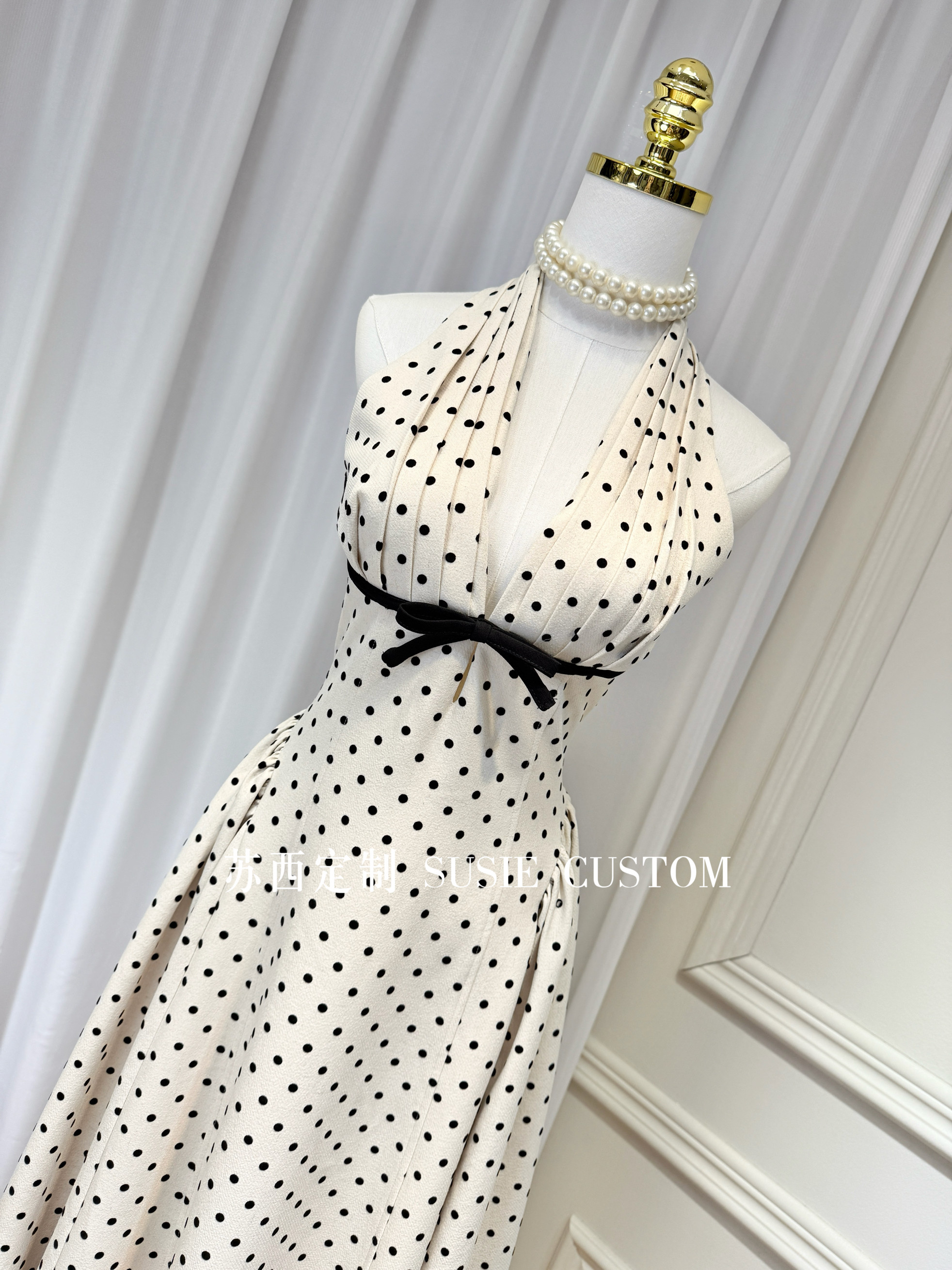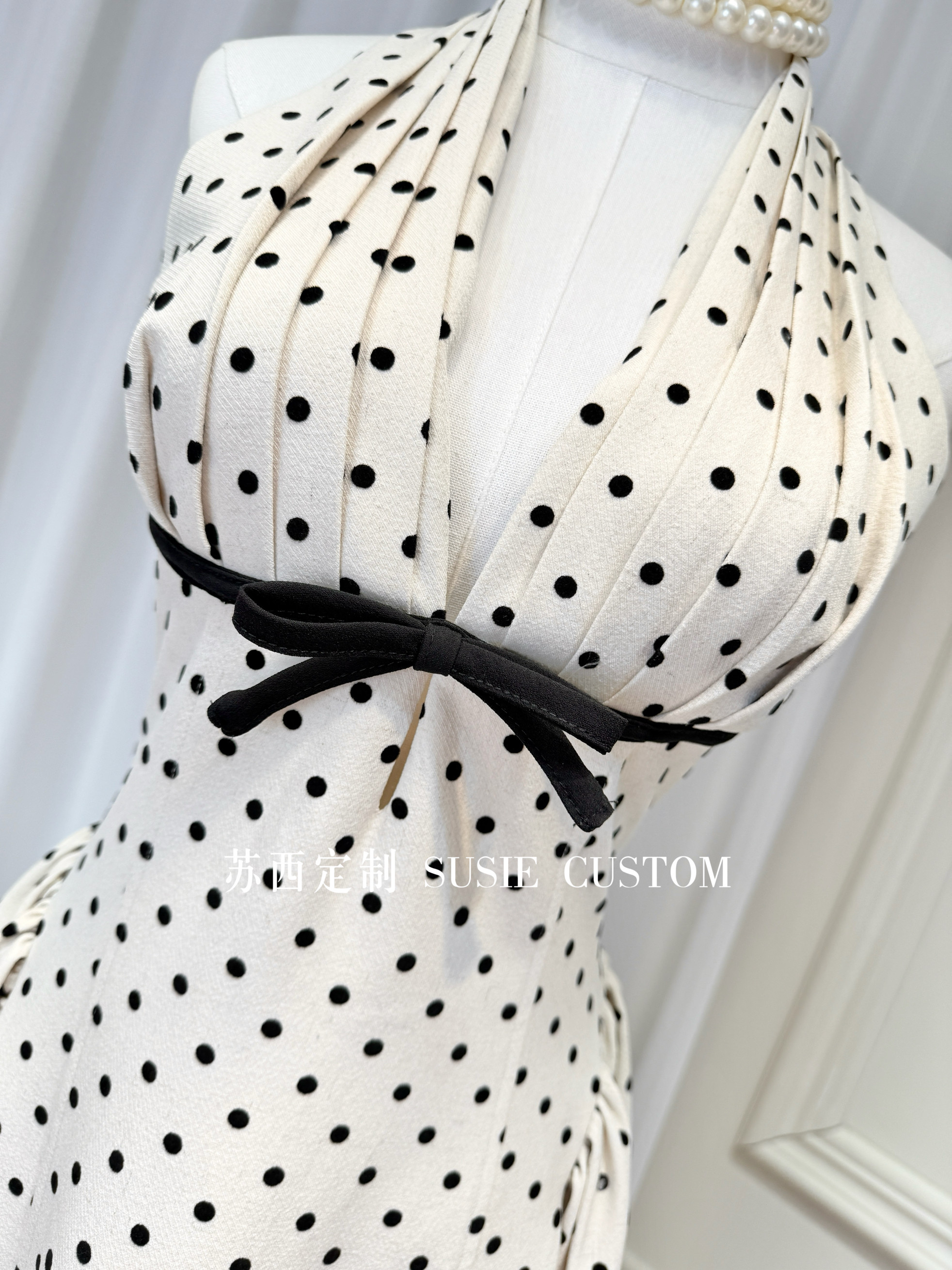 高定越南小众设计款波点深V领挂脖带胸垫露背收腰修身长裙礼服裙