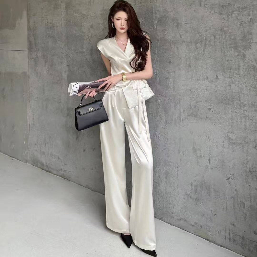 Nice奈一囍|白色法式轻奢缎面马甲上衣女夏季薄款气质阔腿裤套装