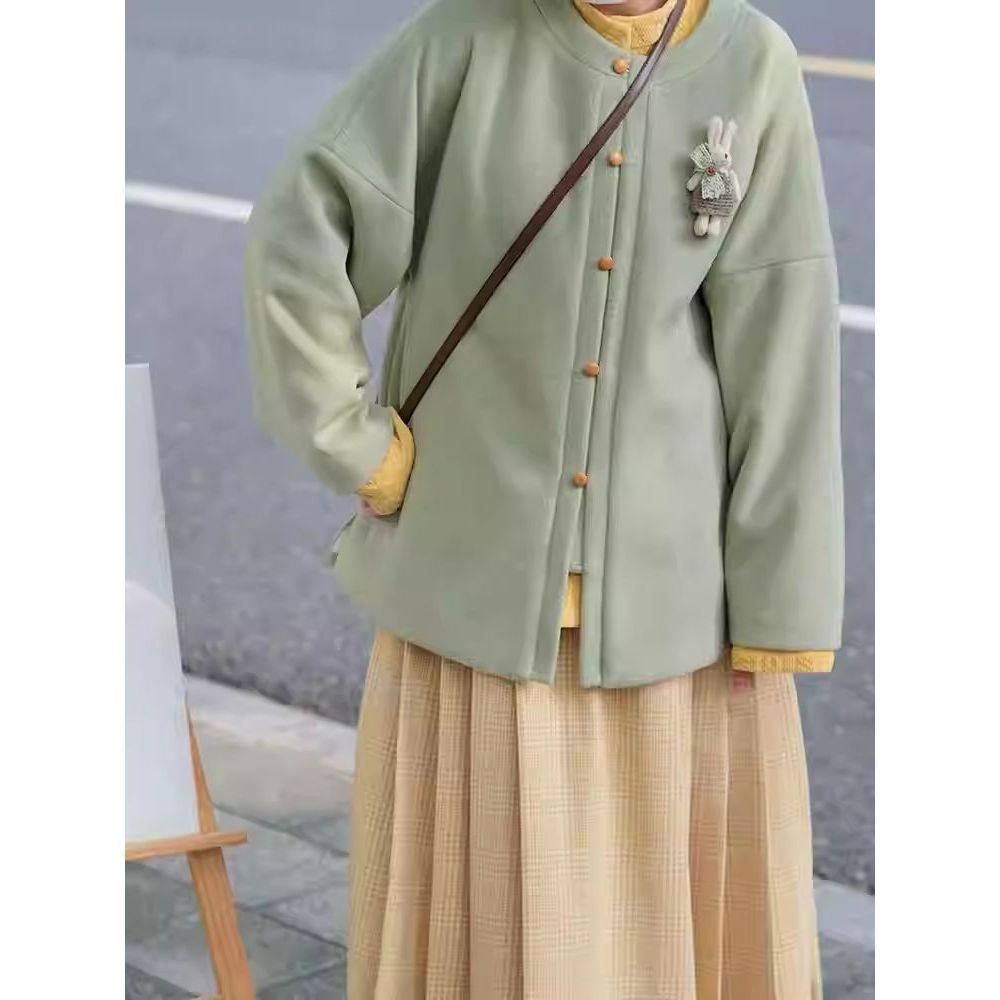 松山煮雨 立领圆领弓袋袖毛呢外套女/松紧马面裙秋冬季国风两件套