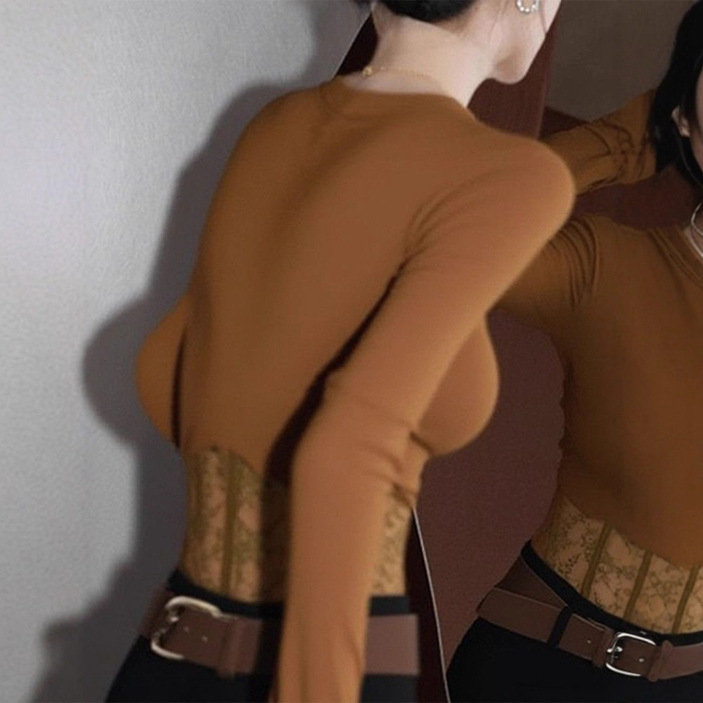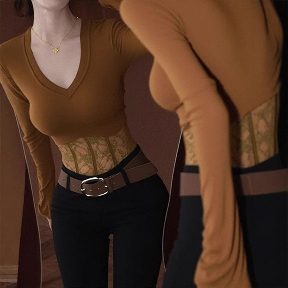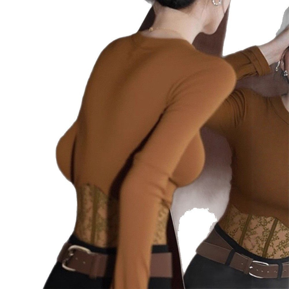 设计感蕾丝拼接内搭长袖t恤上衣秋冬独特辣妹咖色v领正肩打底衫女
