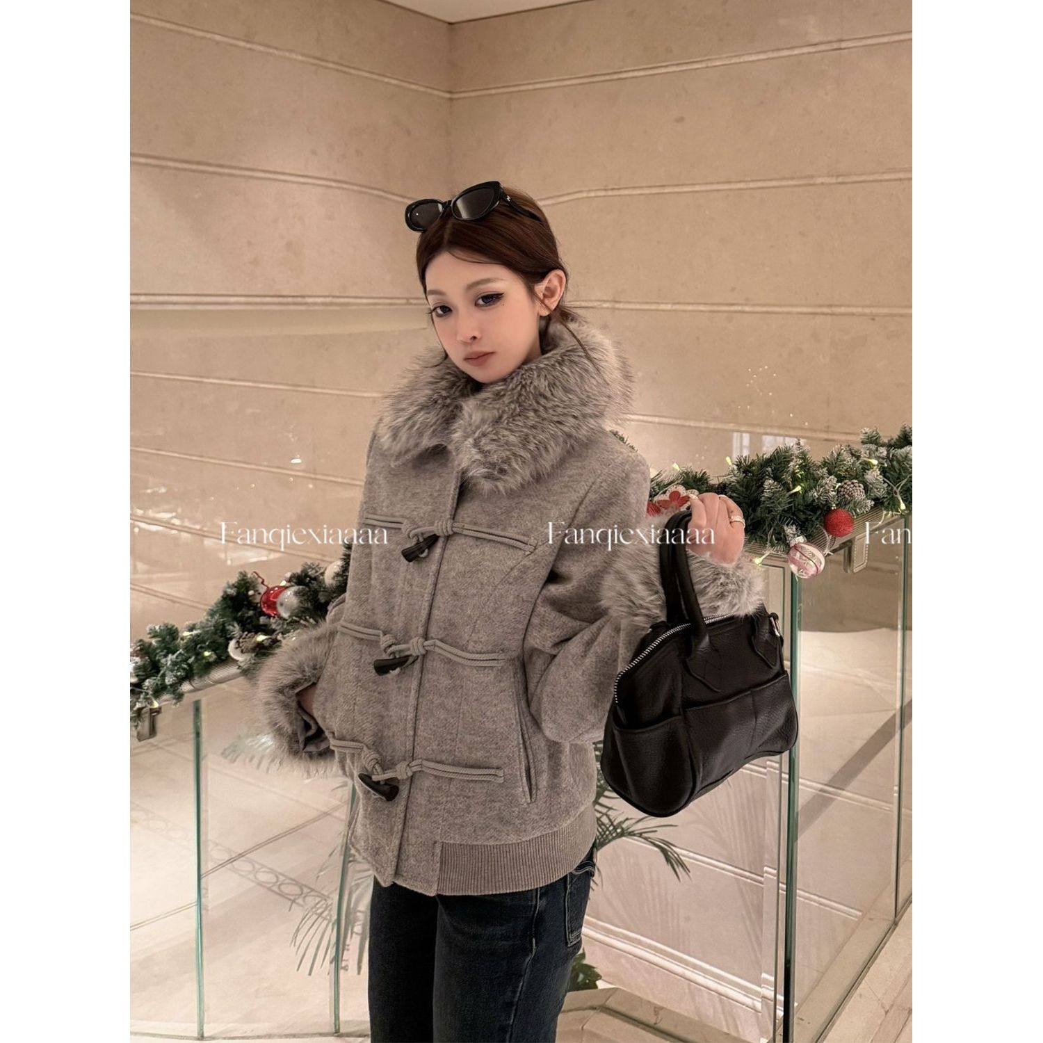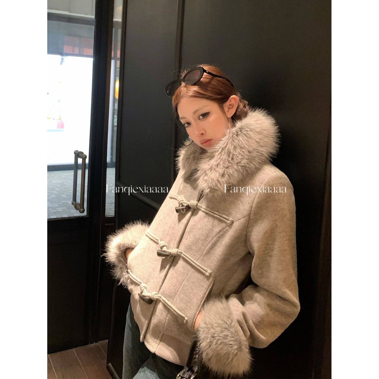摩登腔调 设计感牛角扣可脱卸毛领夹棉毛呢外套女冬新款百搭上衣