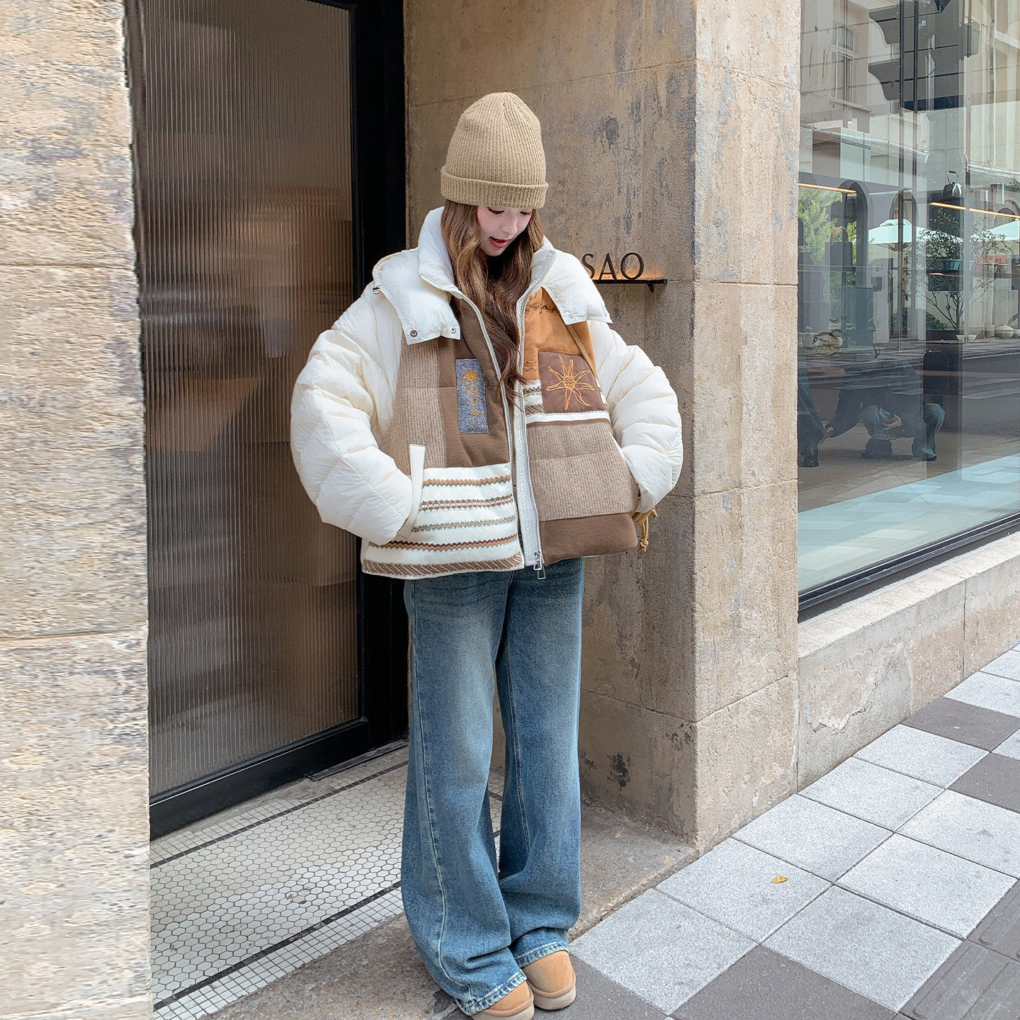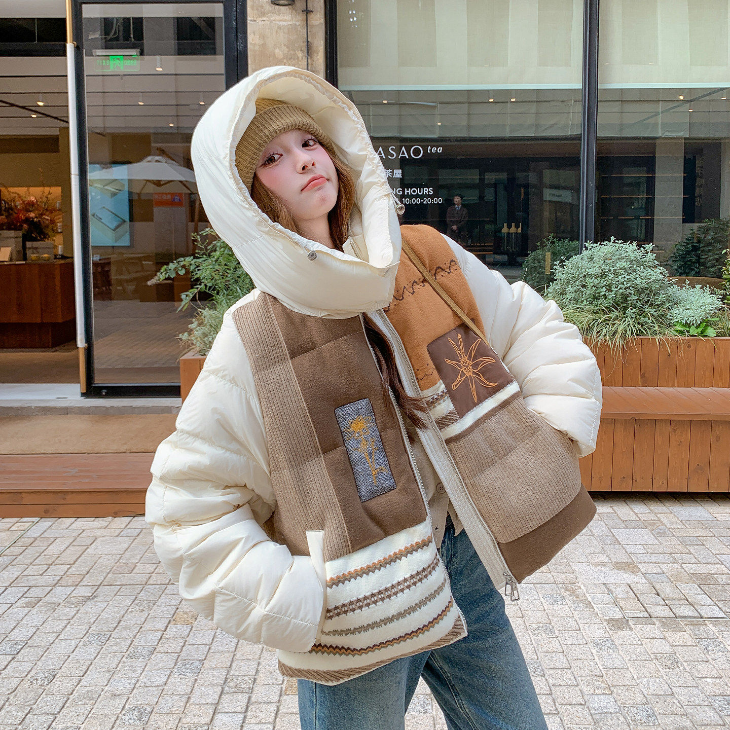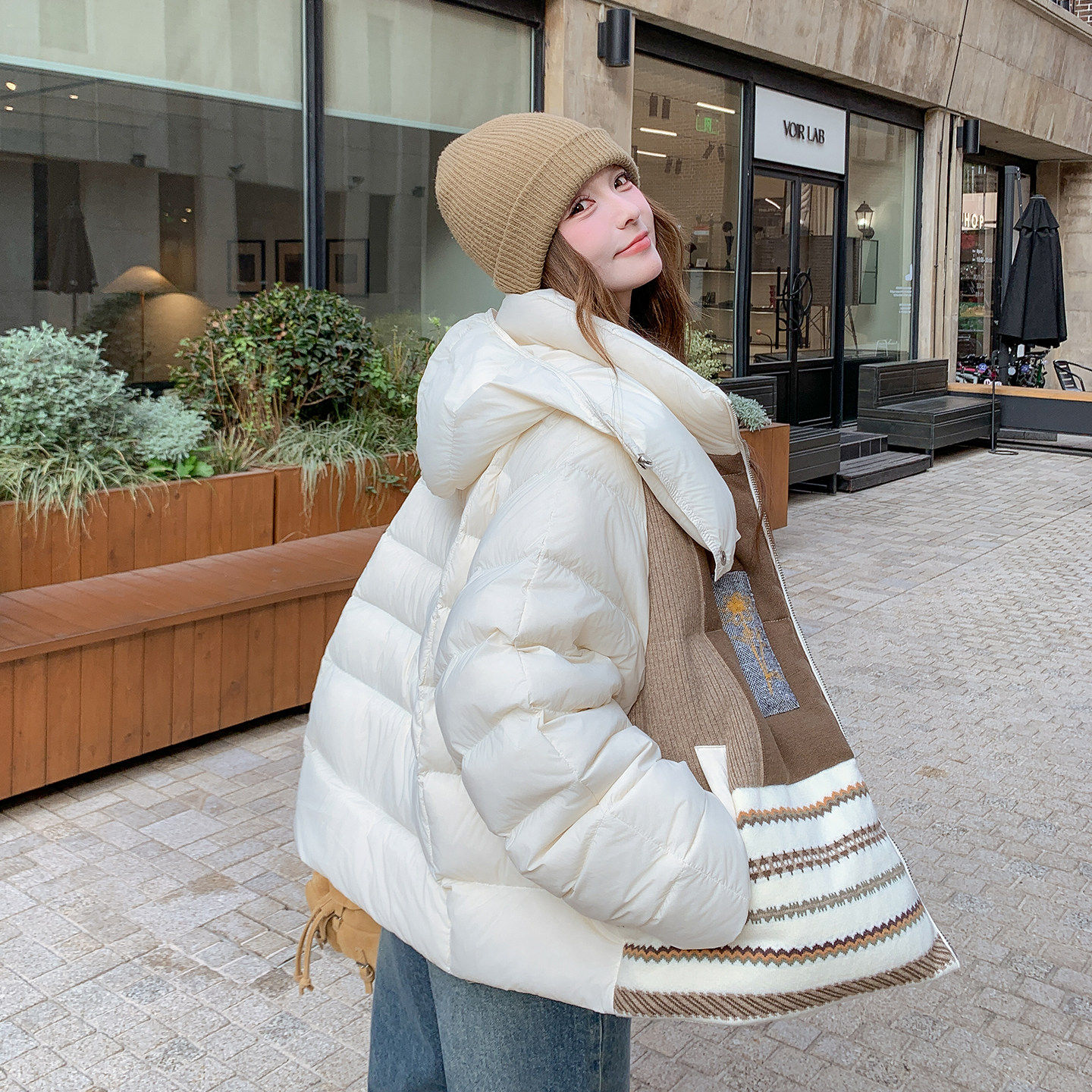 小众设计感撞色拼接连帽羽绒服女2025冬韩系时尚保暖90白鸭绒外套