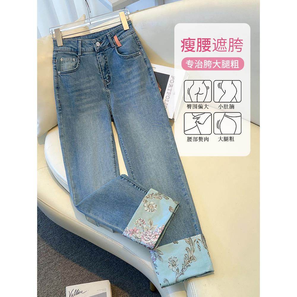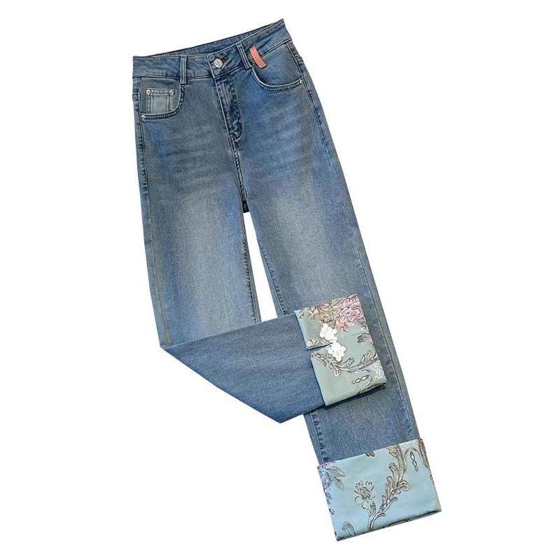 高档垂顺柔软新中式盘扣烟管牛仔裤女爆款春秋刺绣小个九分直筒裤