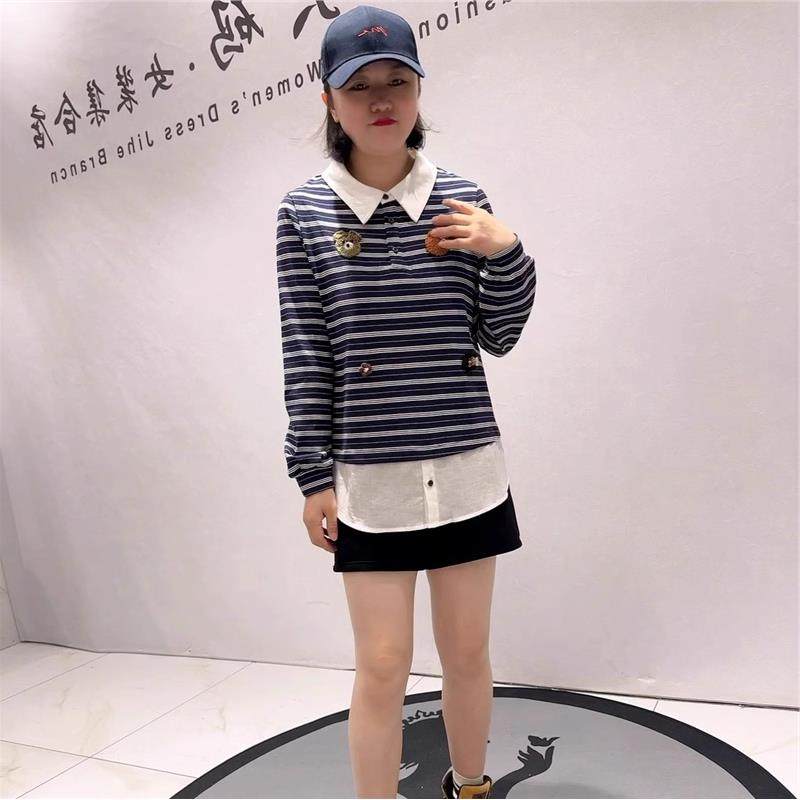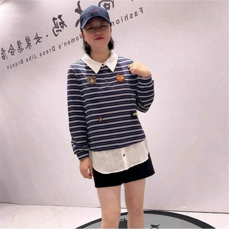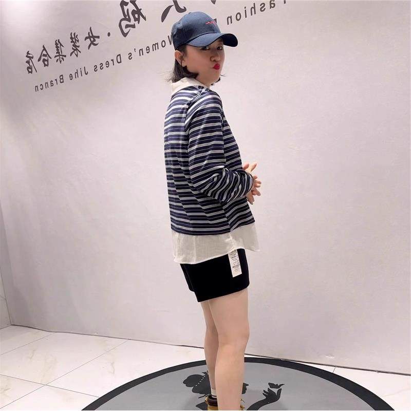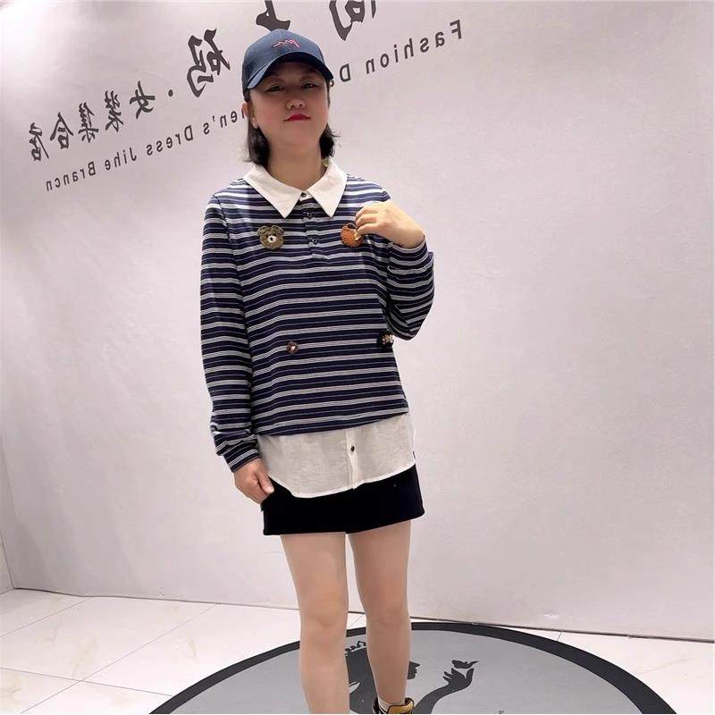 女权贵族2025年货新款条纹假两件衫加大码女装胖mm减龄上衣打底