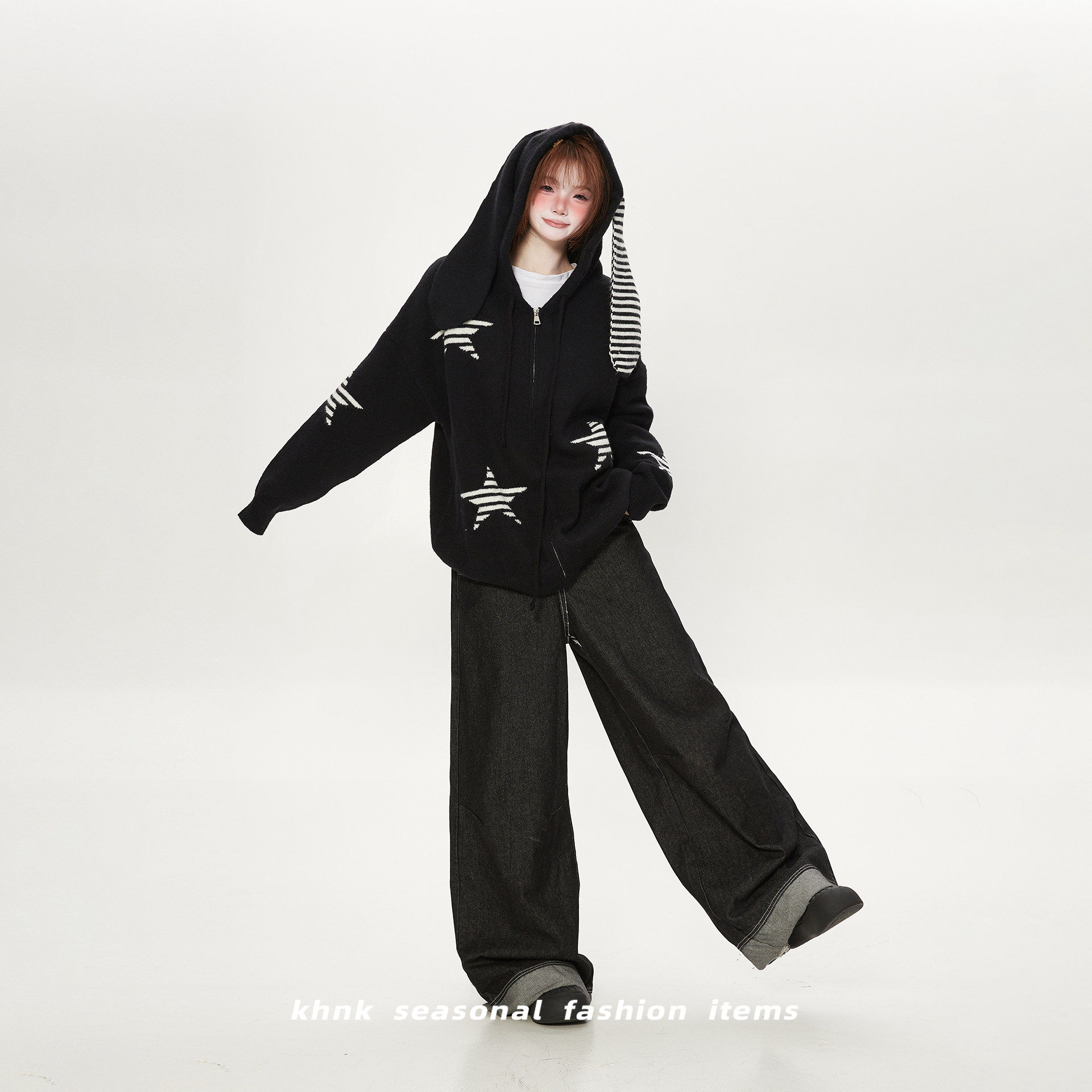 新年穿搭红色兔耳连帽针织开衫女秋冬松弛感星星提花喜庆毛衣外套