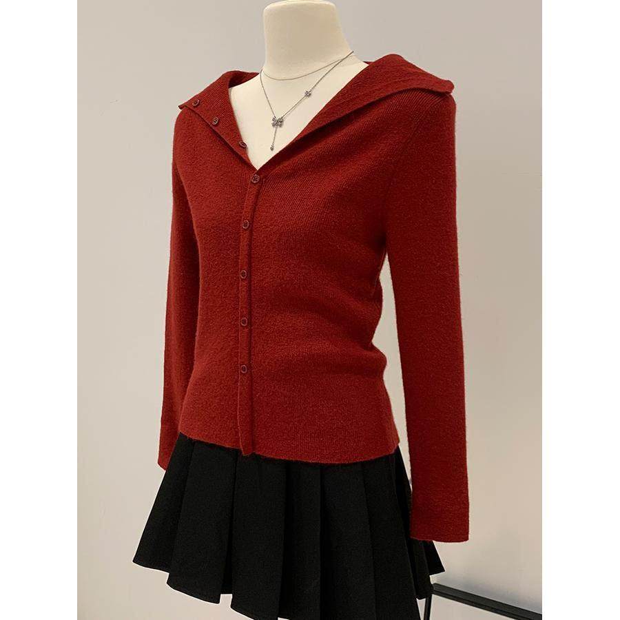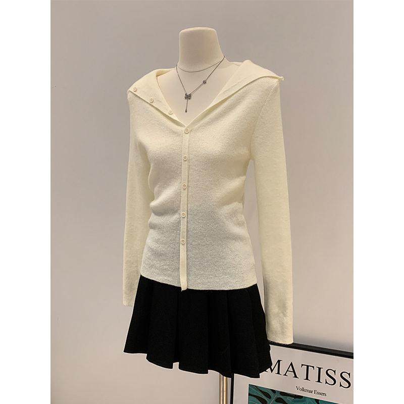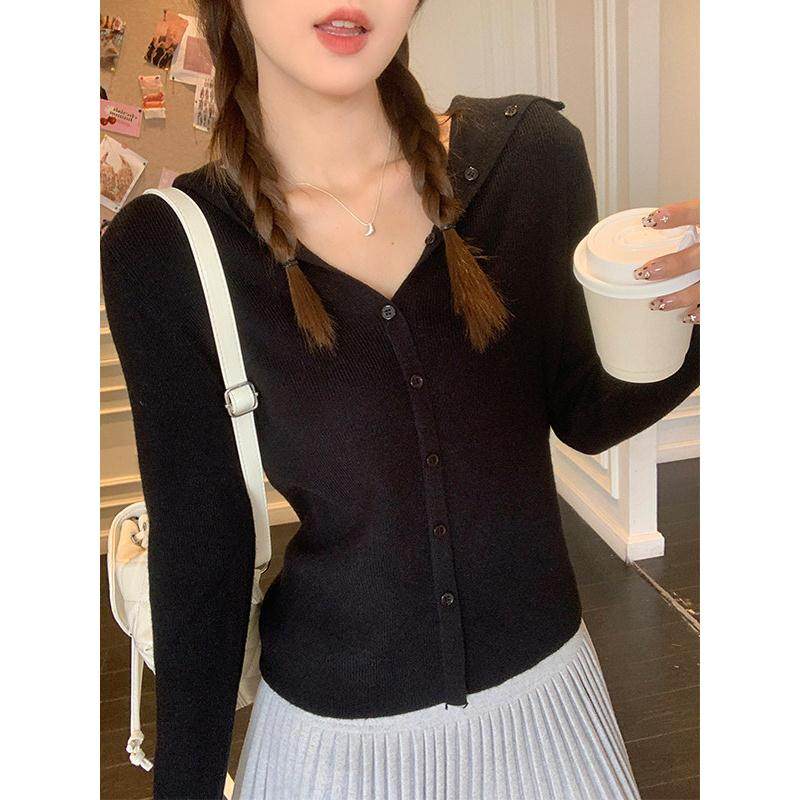 韩国黑色翻领毛衣针织打底衫女2025秋季穿搭修身V领纽扣内搭上衣