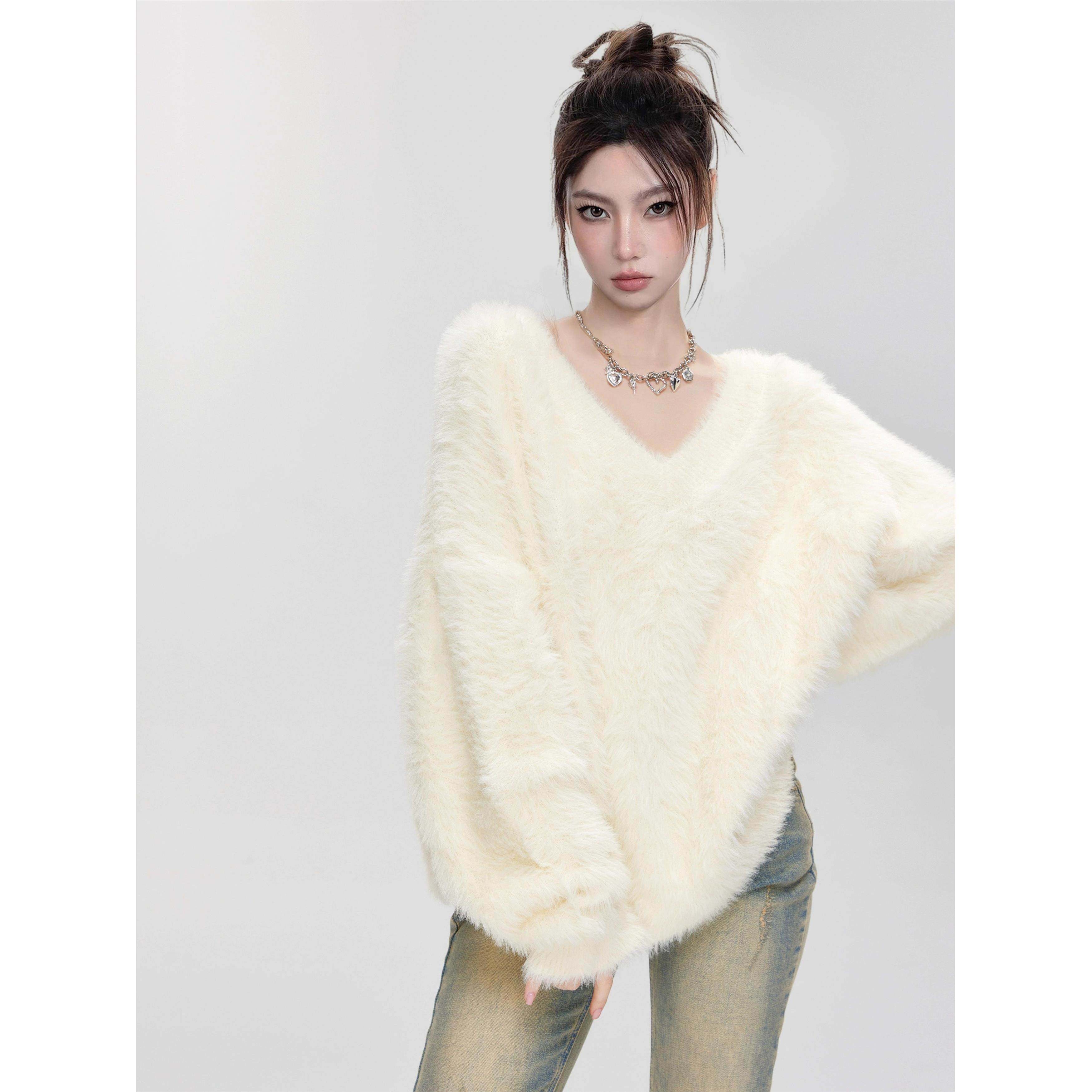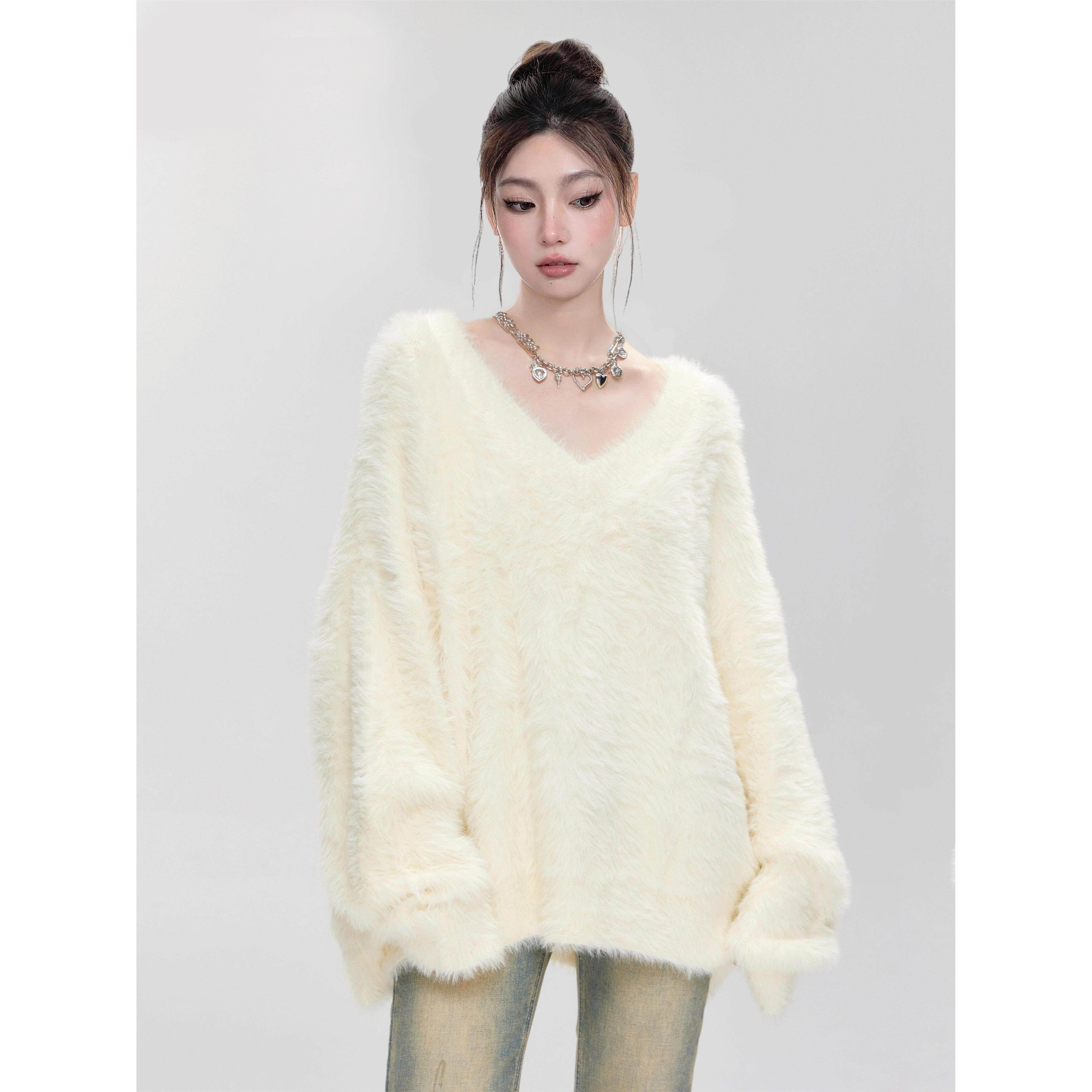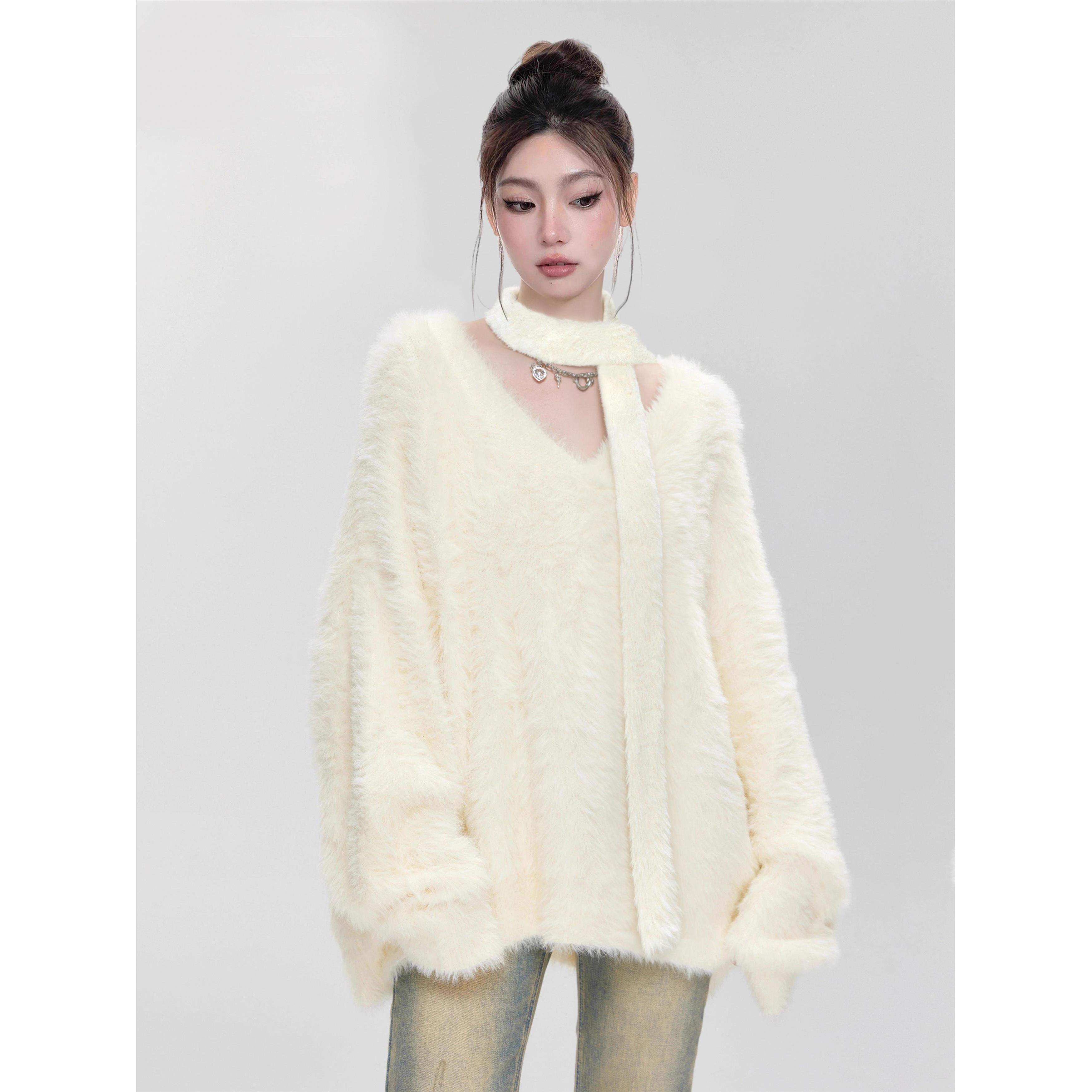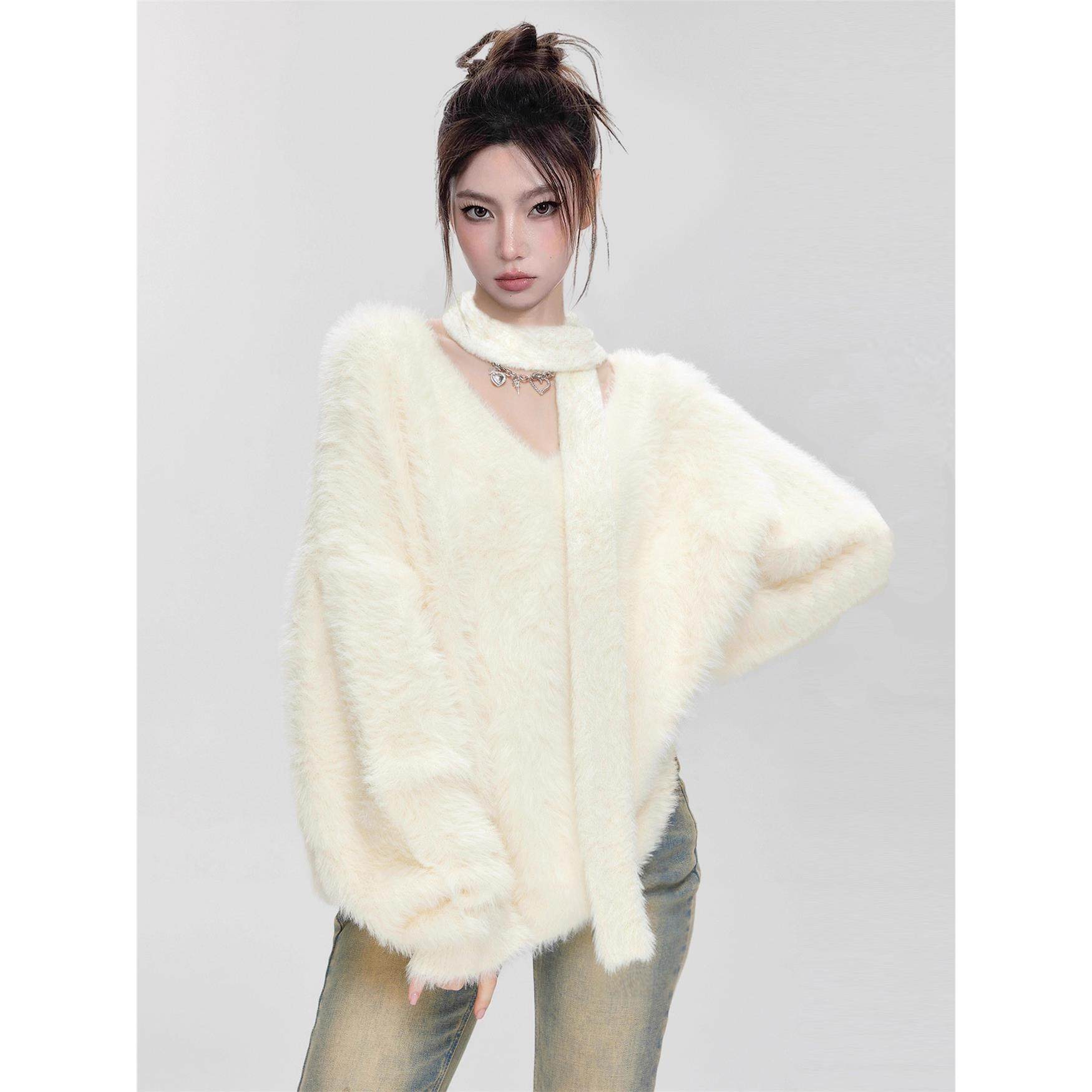 奶fufu白色围巾V领马海毛毛衣女秋冬季加厚软糯套头水貂绒针织衫