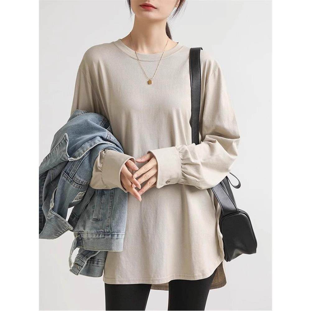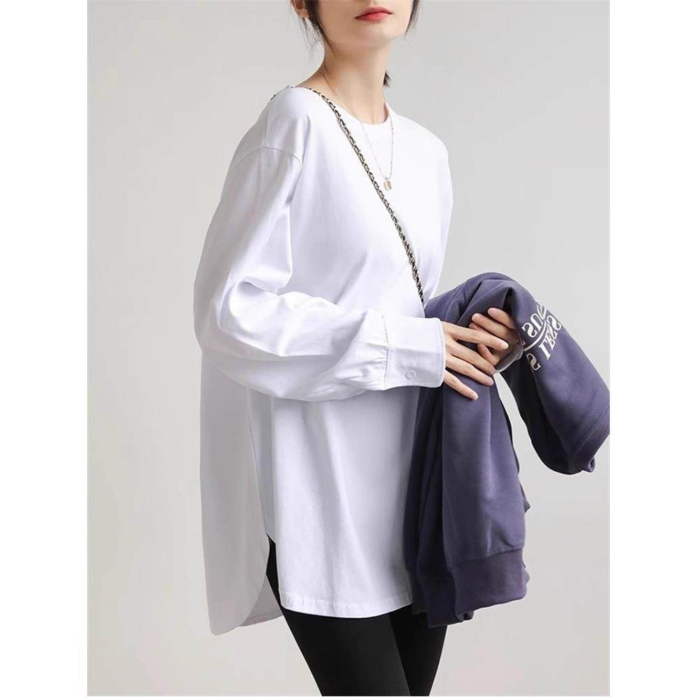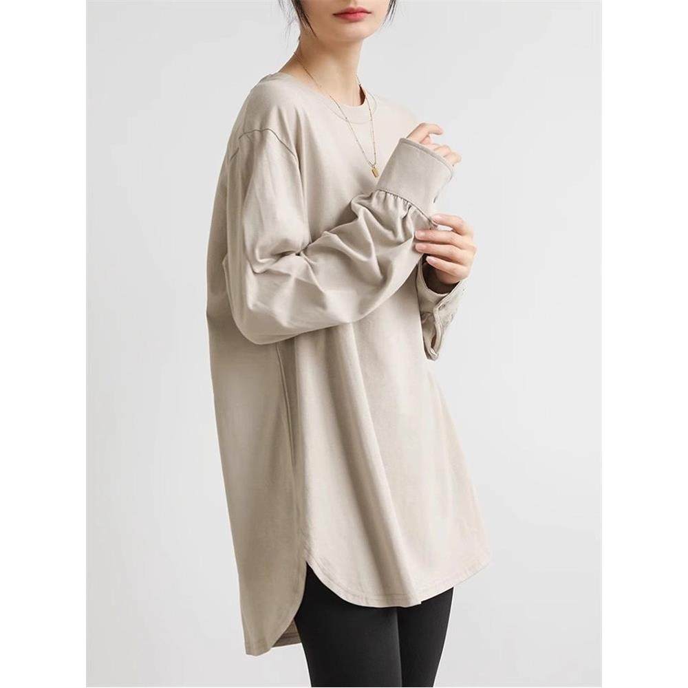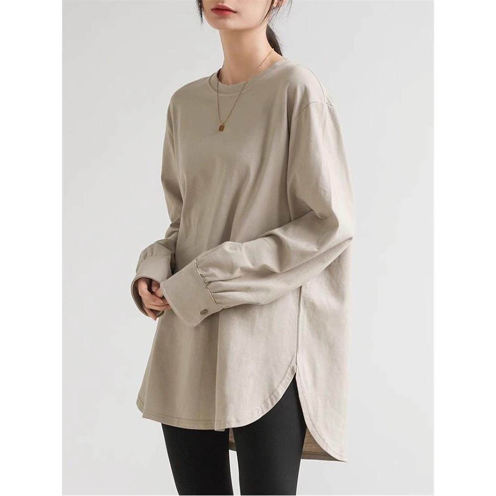 首页> 女装> 2025春秋新款长袖T恤女中长款宽松休闲叠穿弧边设计感内搭打底衫
