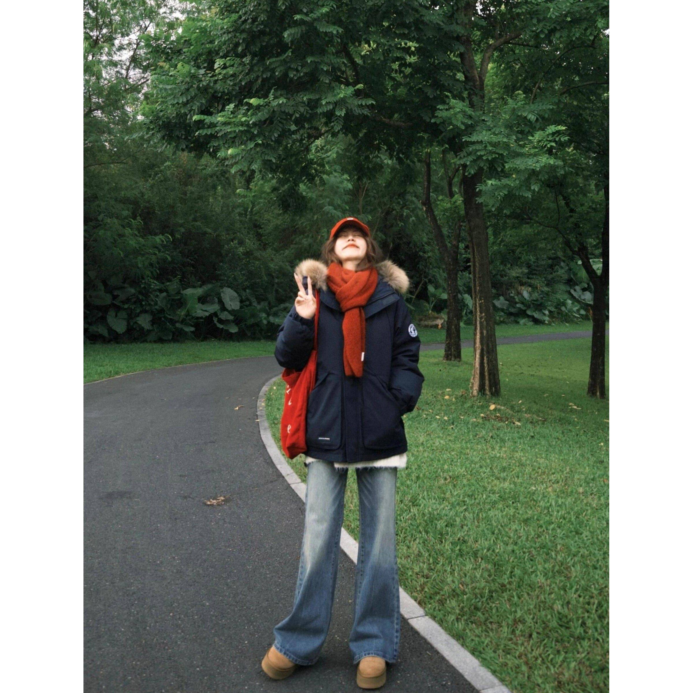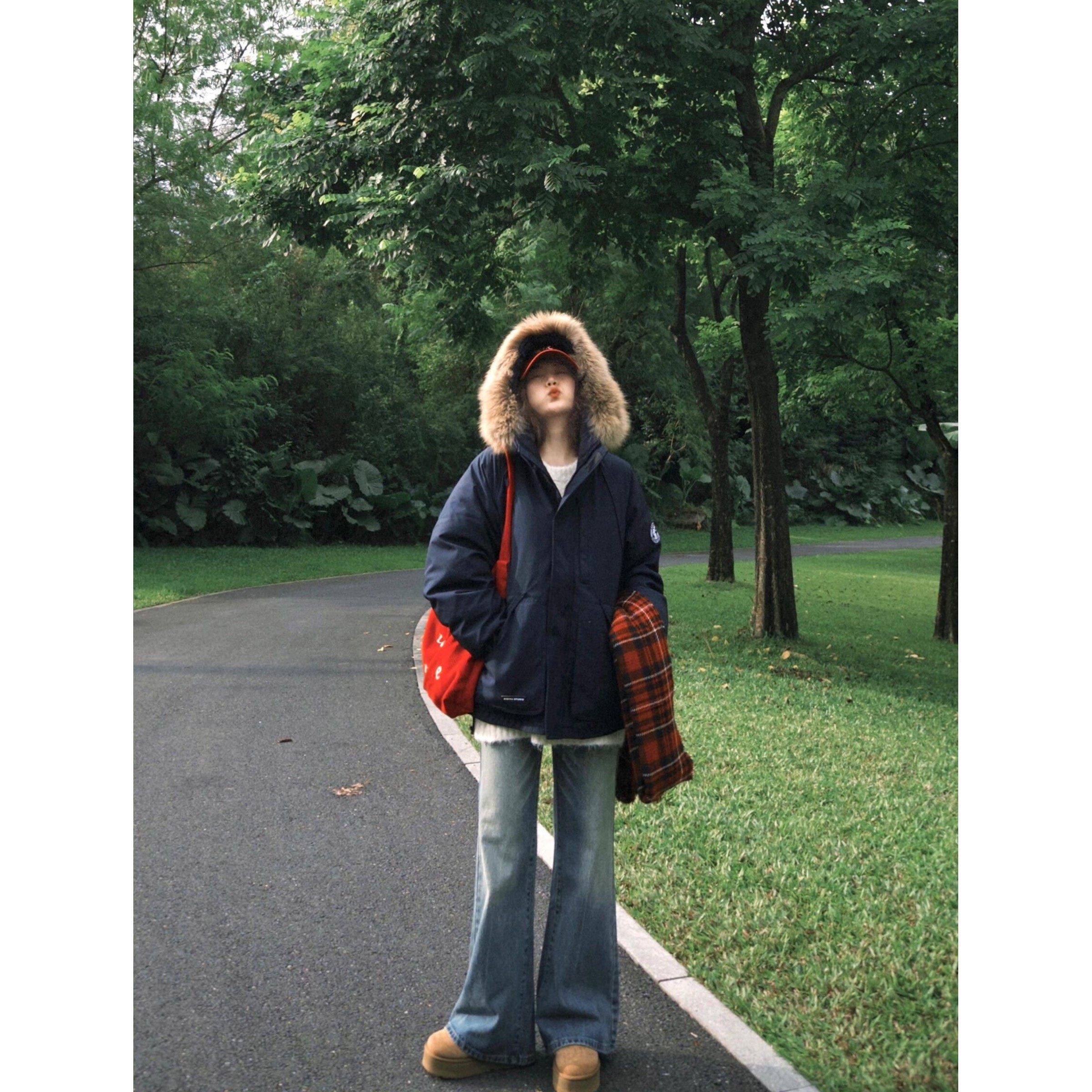 巨好看藏青色派克羽绒服女短款连帽工装加厚冬季毛领90白鸭绒外套