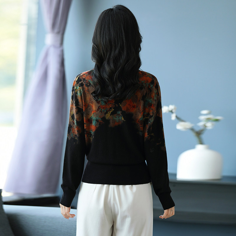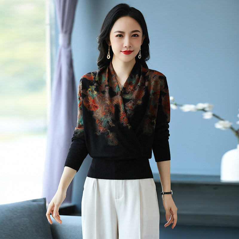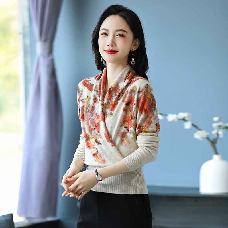 优雅风印花交叉领毛衣女宽松显瘦洋气针织衫气质打底衫