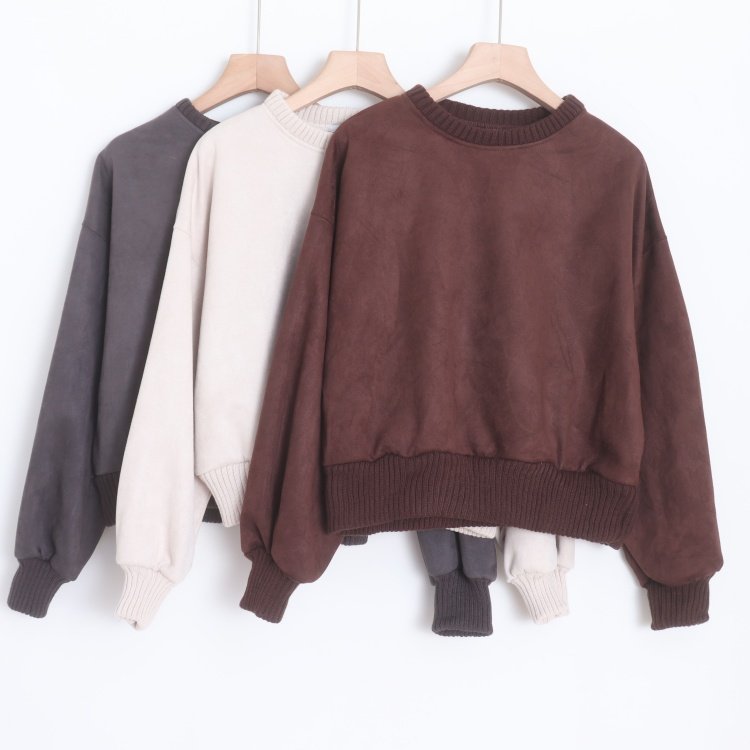 首页> 女装> D16030日单新款客供料毛线螺纹领套头宽松女纯色休闲麂皮绒卫衣