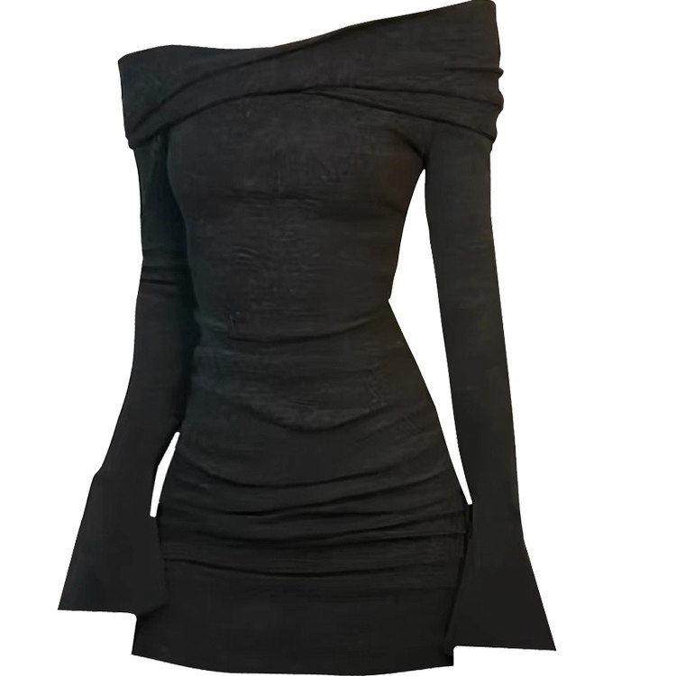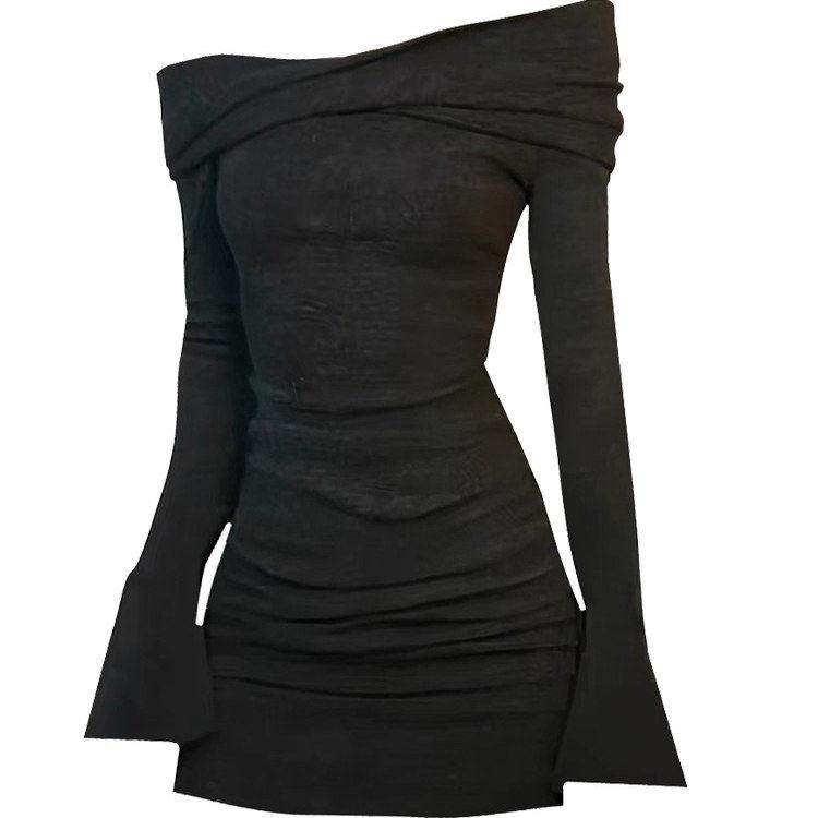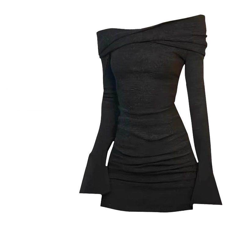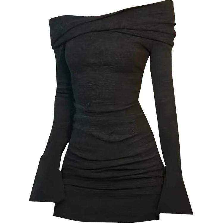新品香港秋冬新款辣妹一字肩收腰长袖连衣裙女修身显瘦露肩包臀裙
