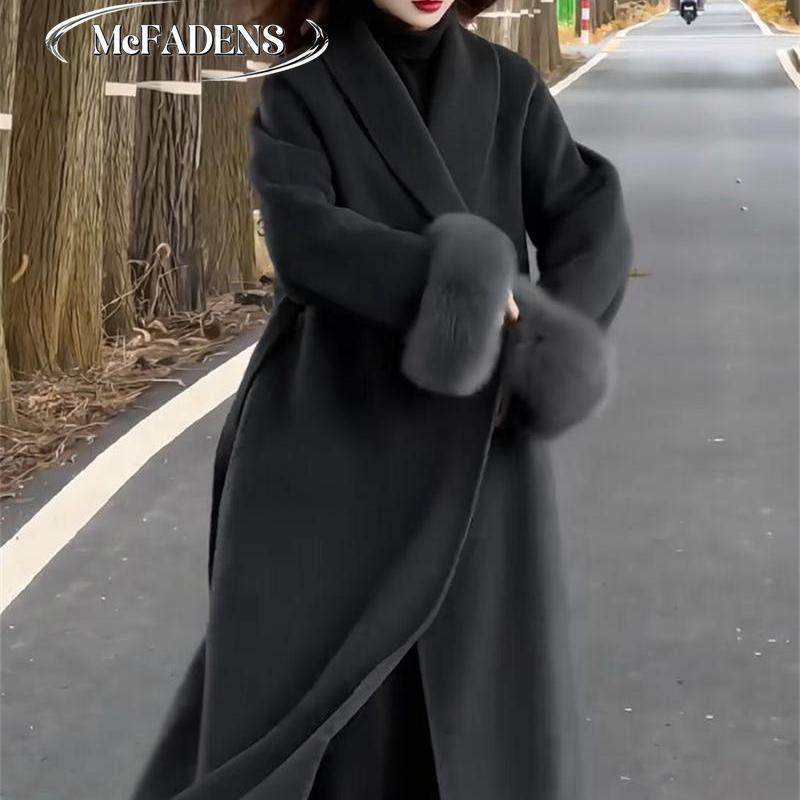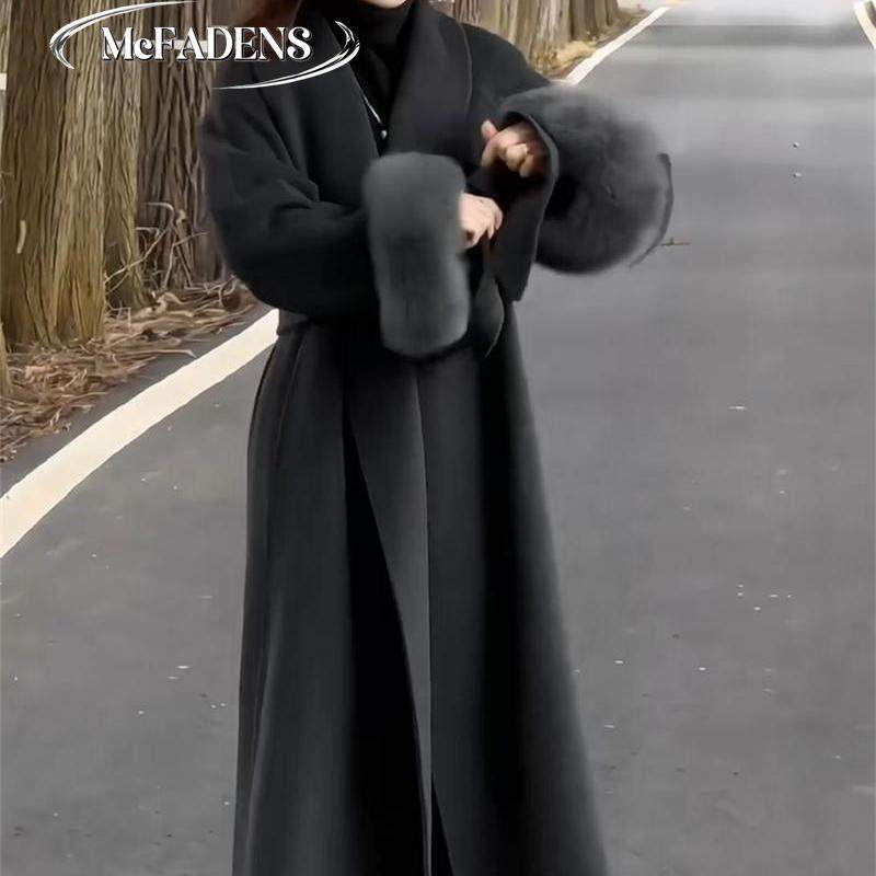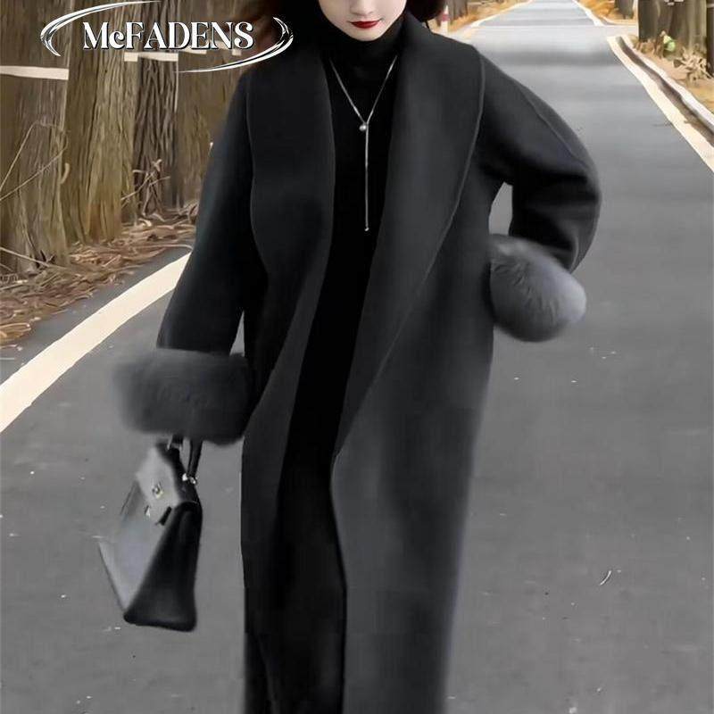 香港欧洲站2024冬季新款毛呢过膝长款韩版袖口拼接设计女大衣外套