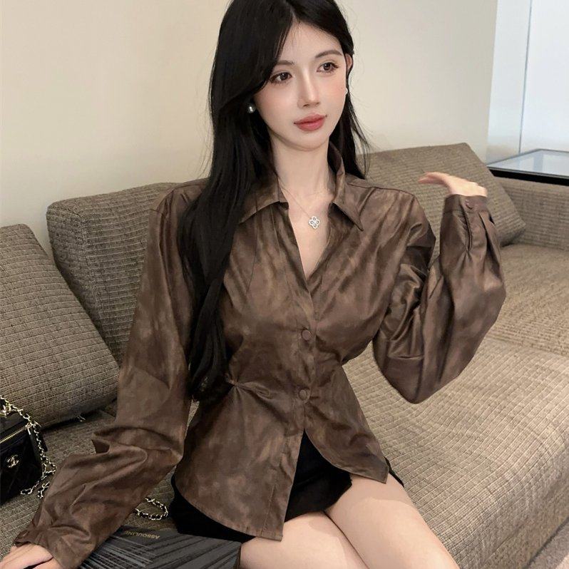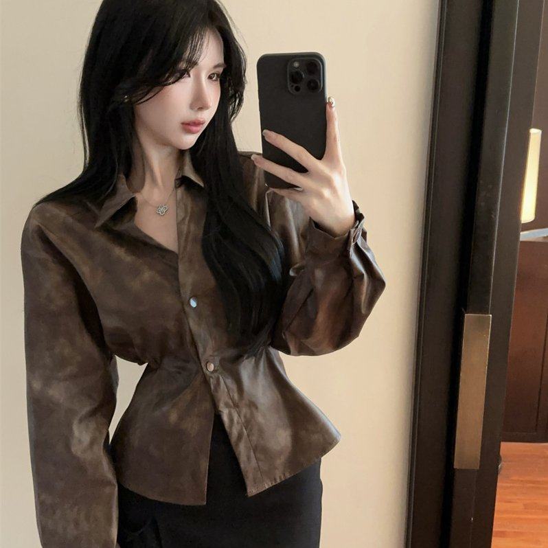 实拍设计感镂空露腰收腰系带长袖软皮翻领衬衫实价