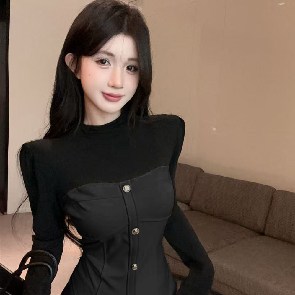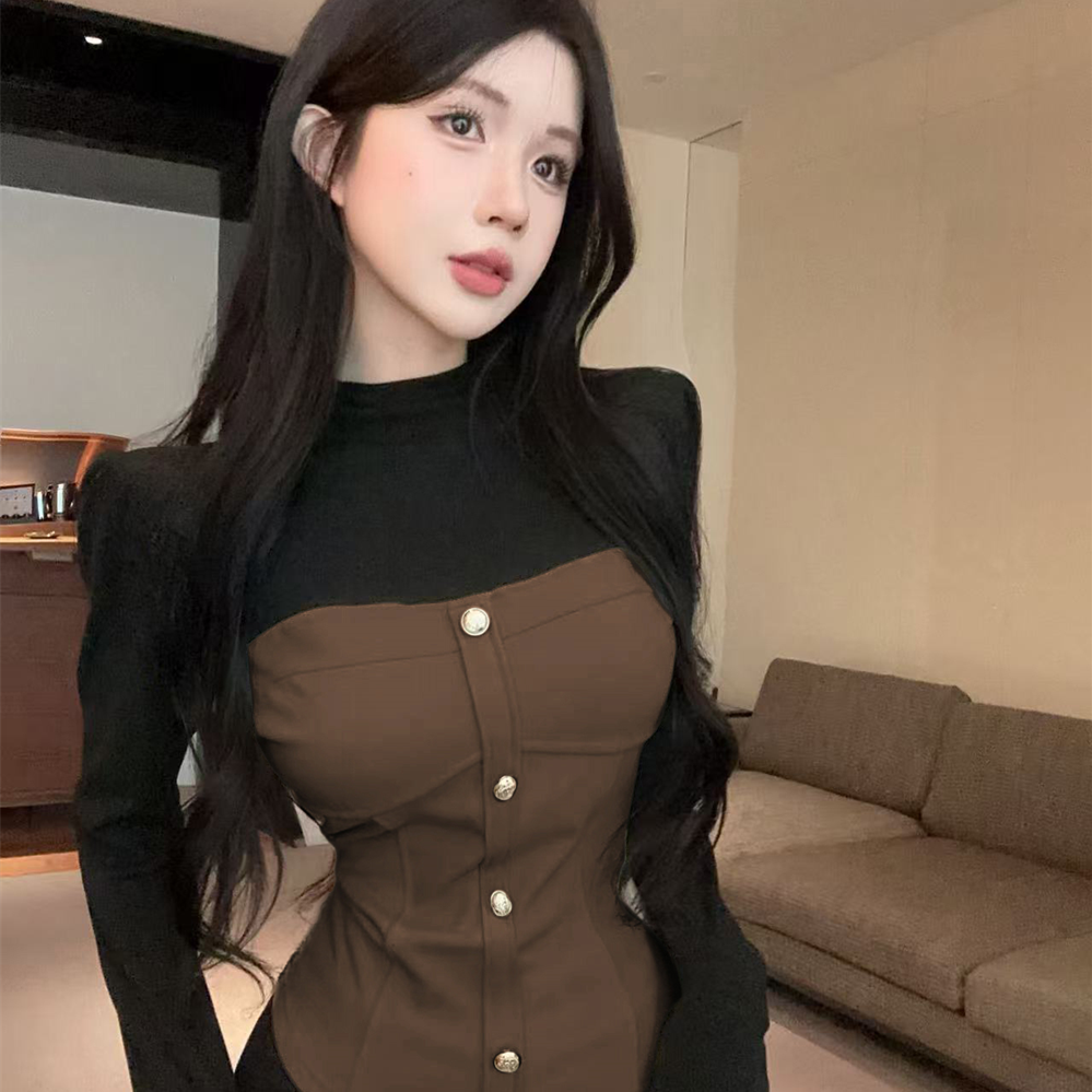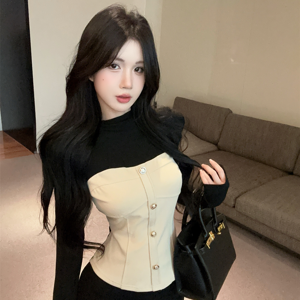 实拍韩版圆领拼接加绒单排扣修身短款撞色假两件套辣妹打底T恤潮