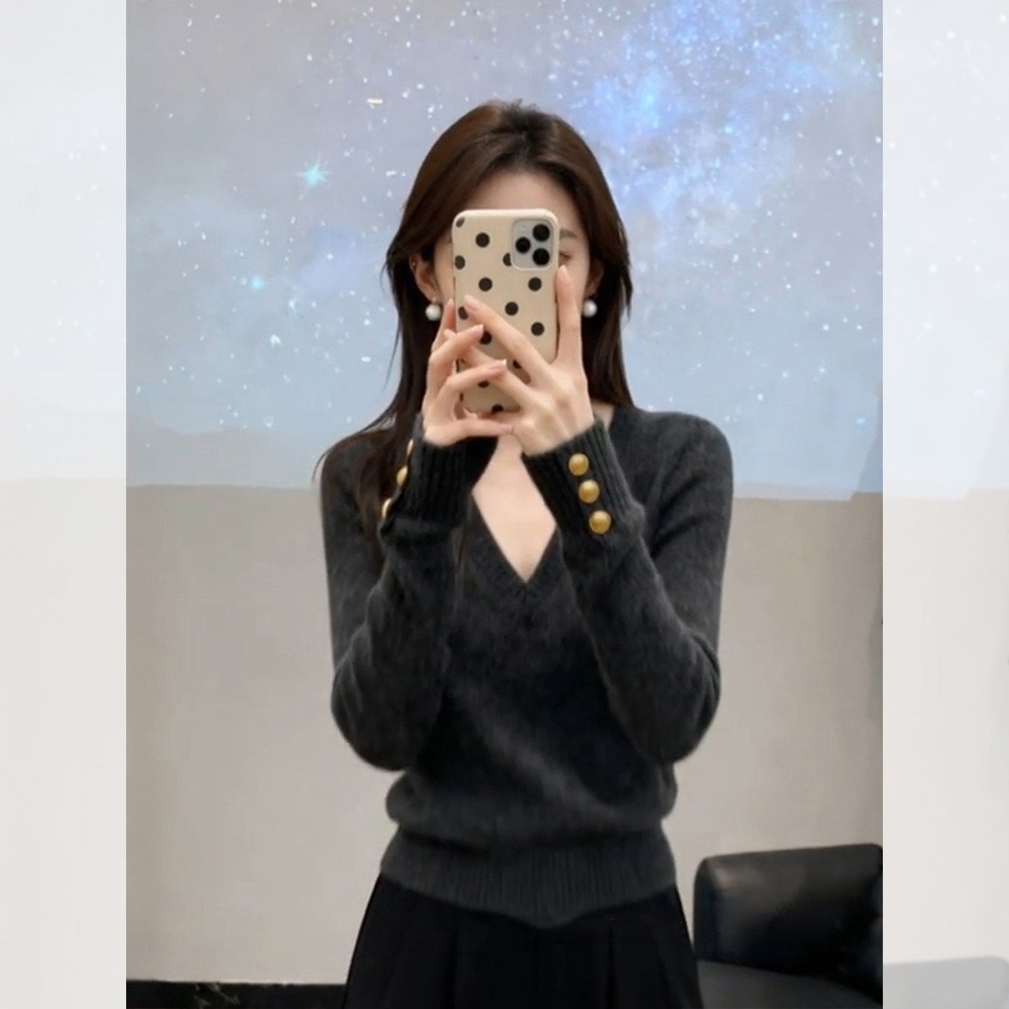 法式小香风灰色V领针织打底衫女秋冬轻奢高级感毛衣内搭气质上衣