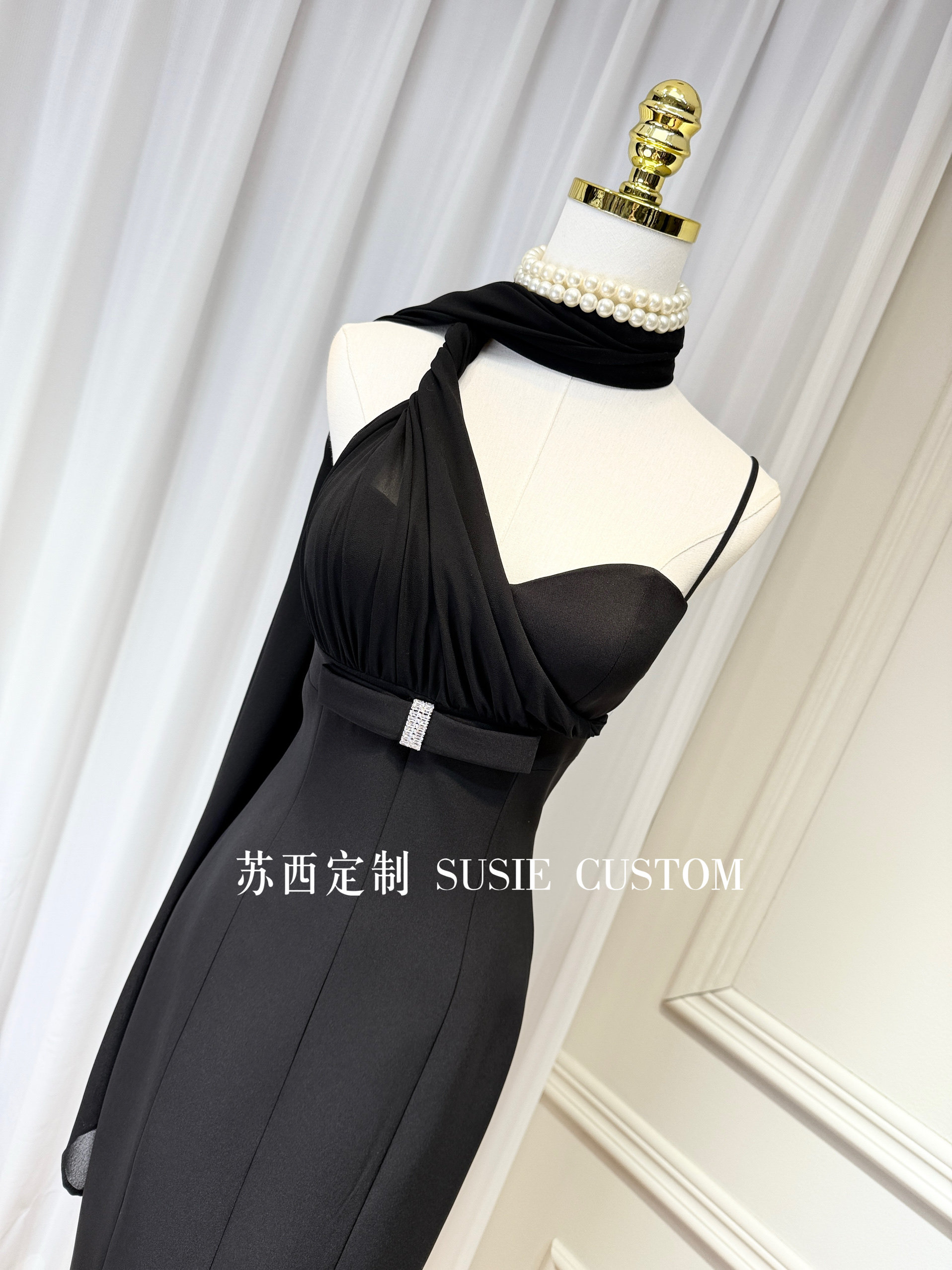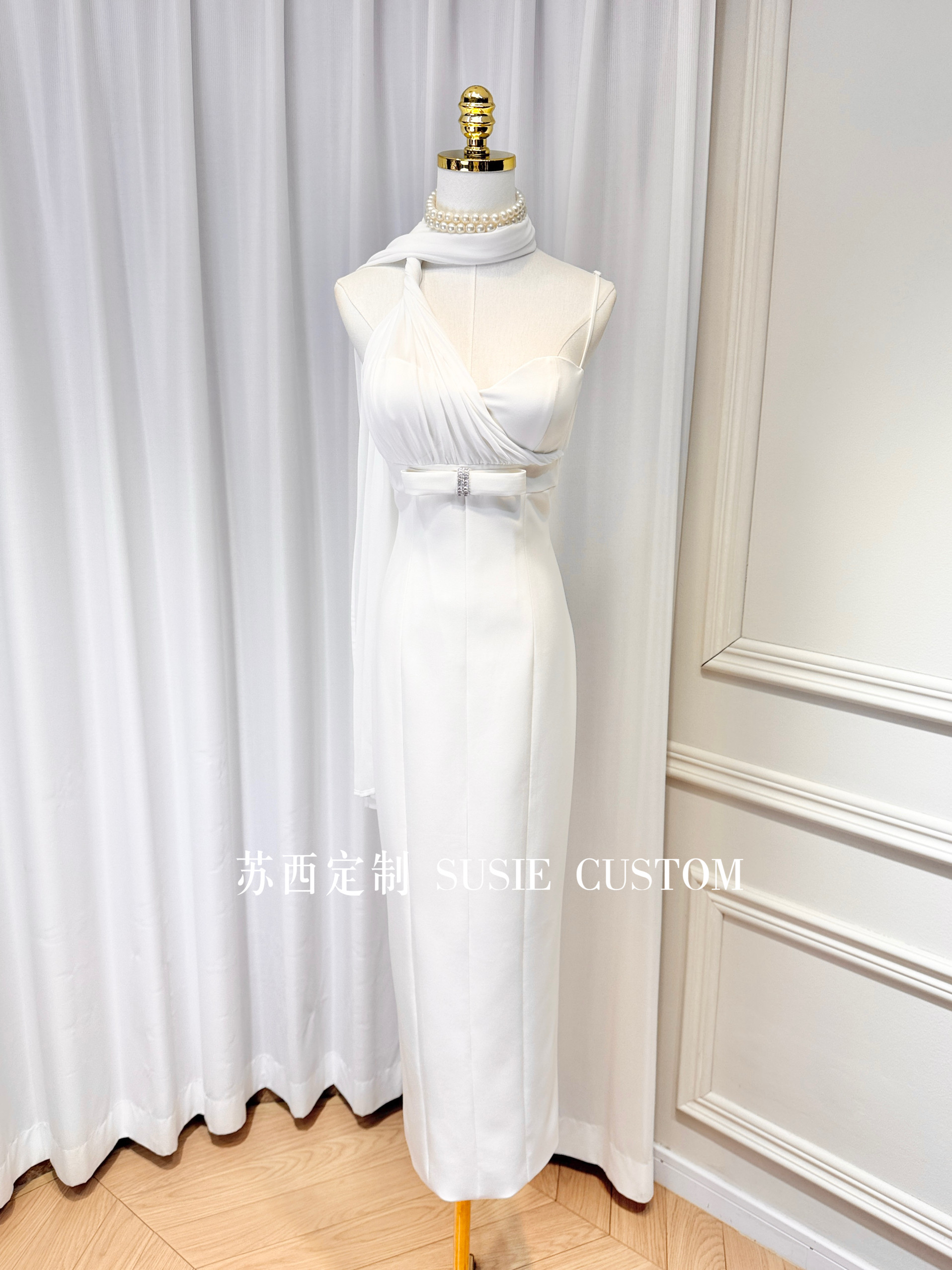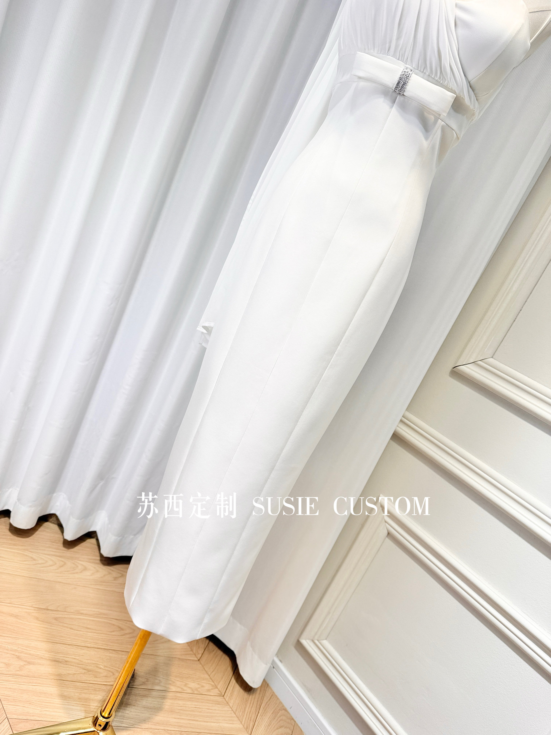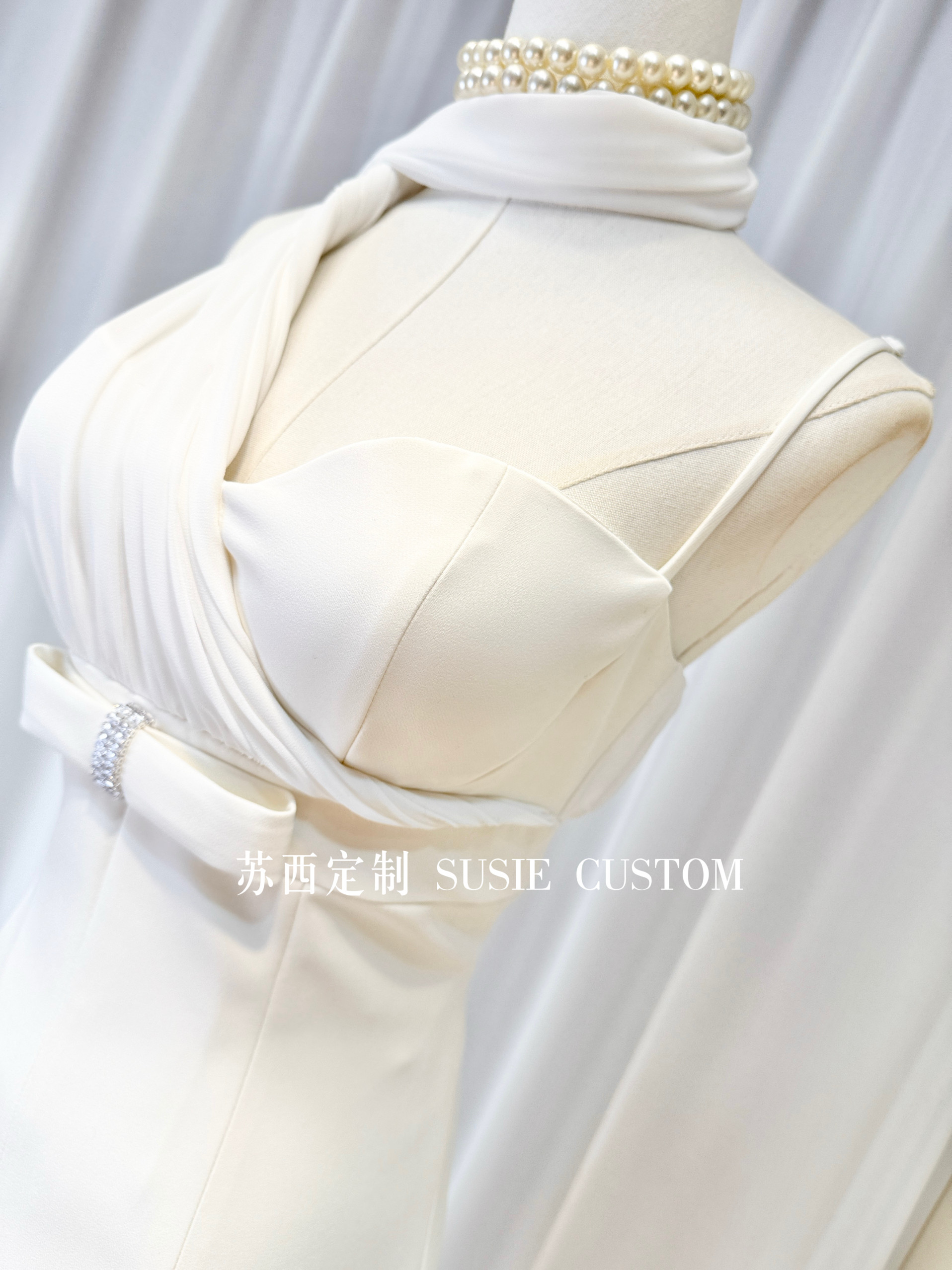 高定设计款气质显身材带胸垫褶皱飘带蝴蝶结钻扣修身吊带长裙礼服