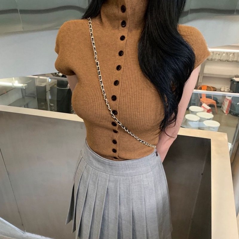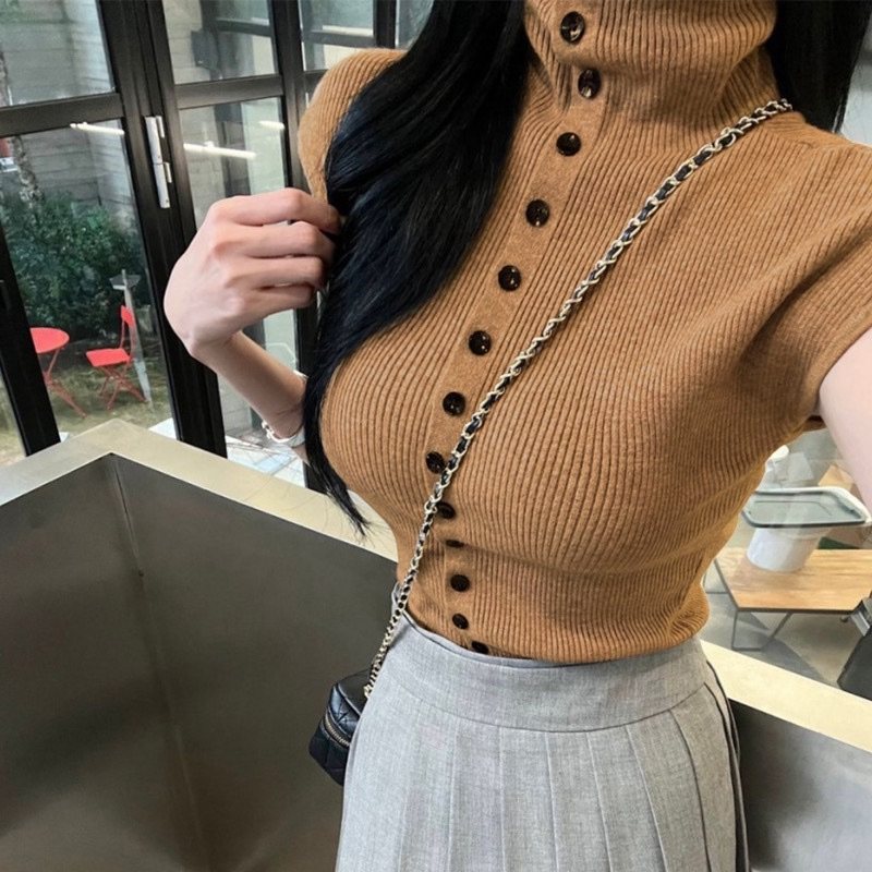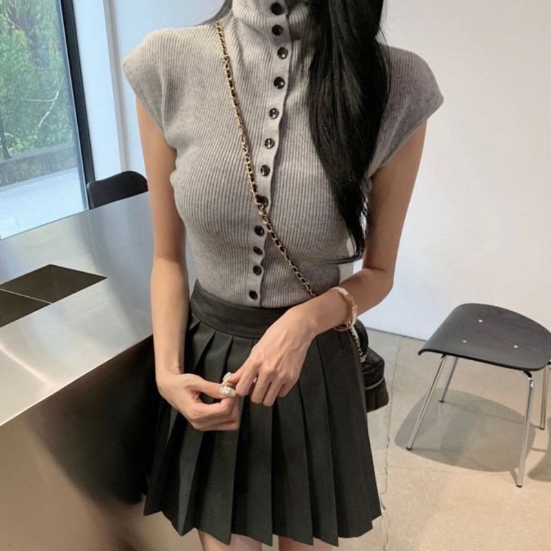 韩国东大门新款韩里韩气~高领针织背心简约单排扣性感无袖女上衣