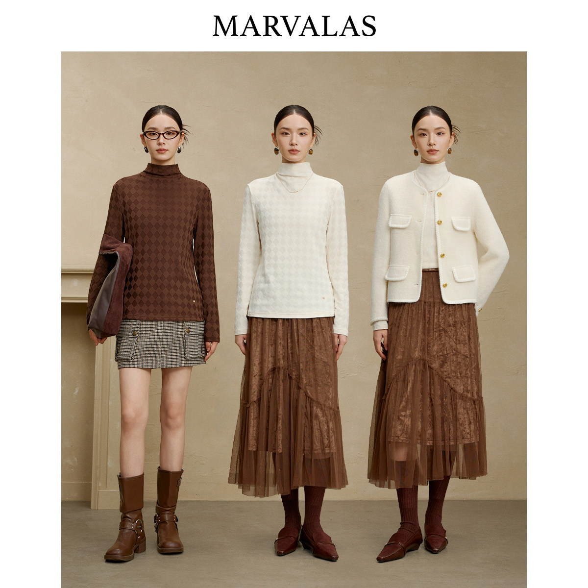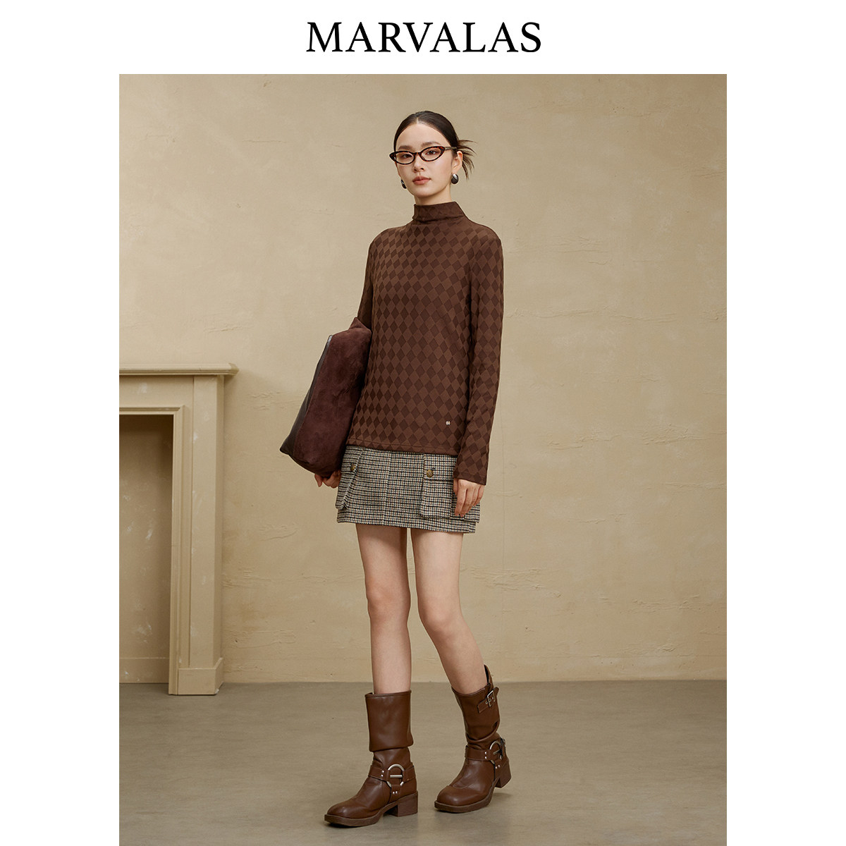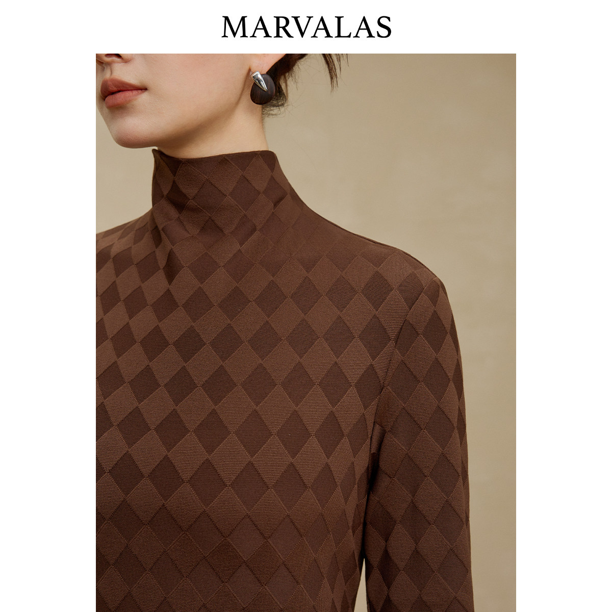 【添添粉丝专属】曼德诗菱格暗纹T恤2025冬季新款一体半高领打底