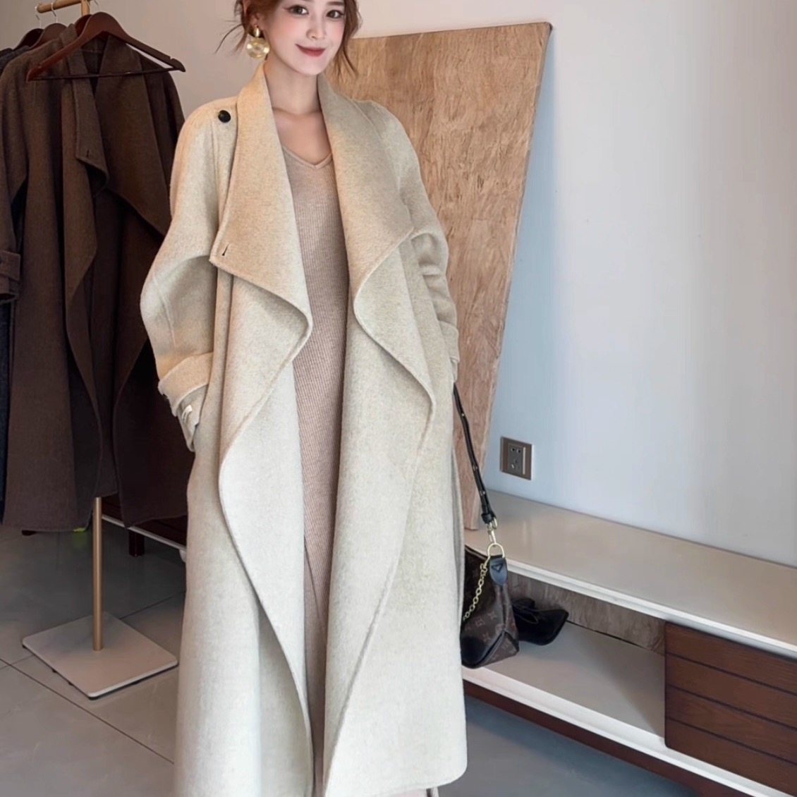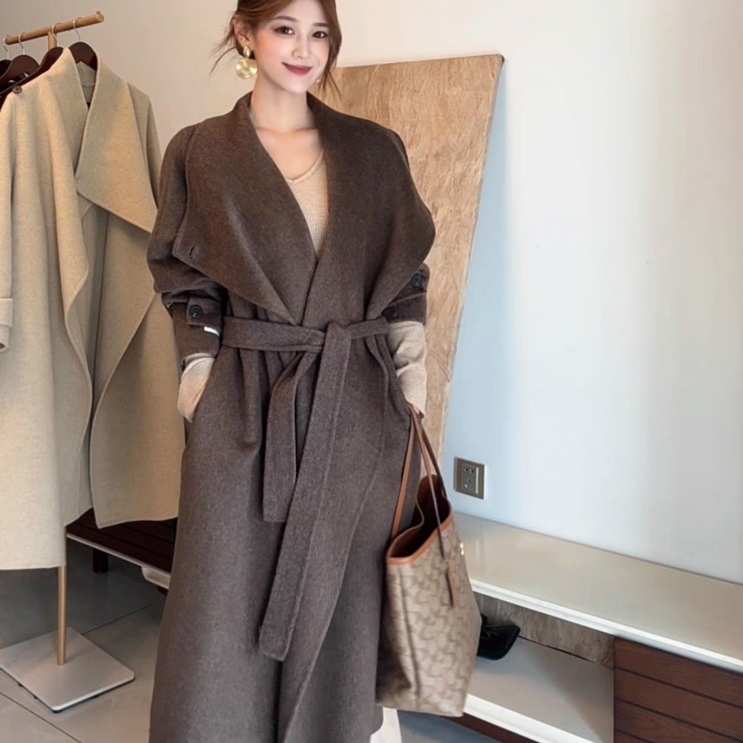 【盐风棱语】25年秋冬新款休闲腰带中长款双面羊毛大衣外套女装