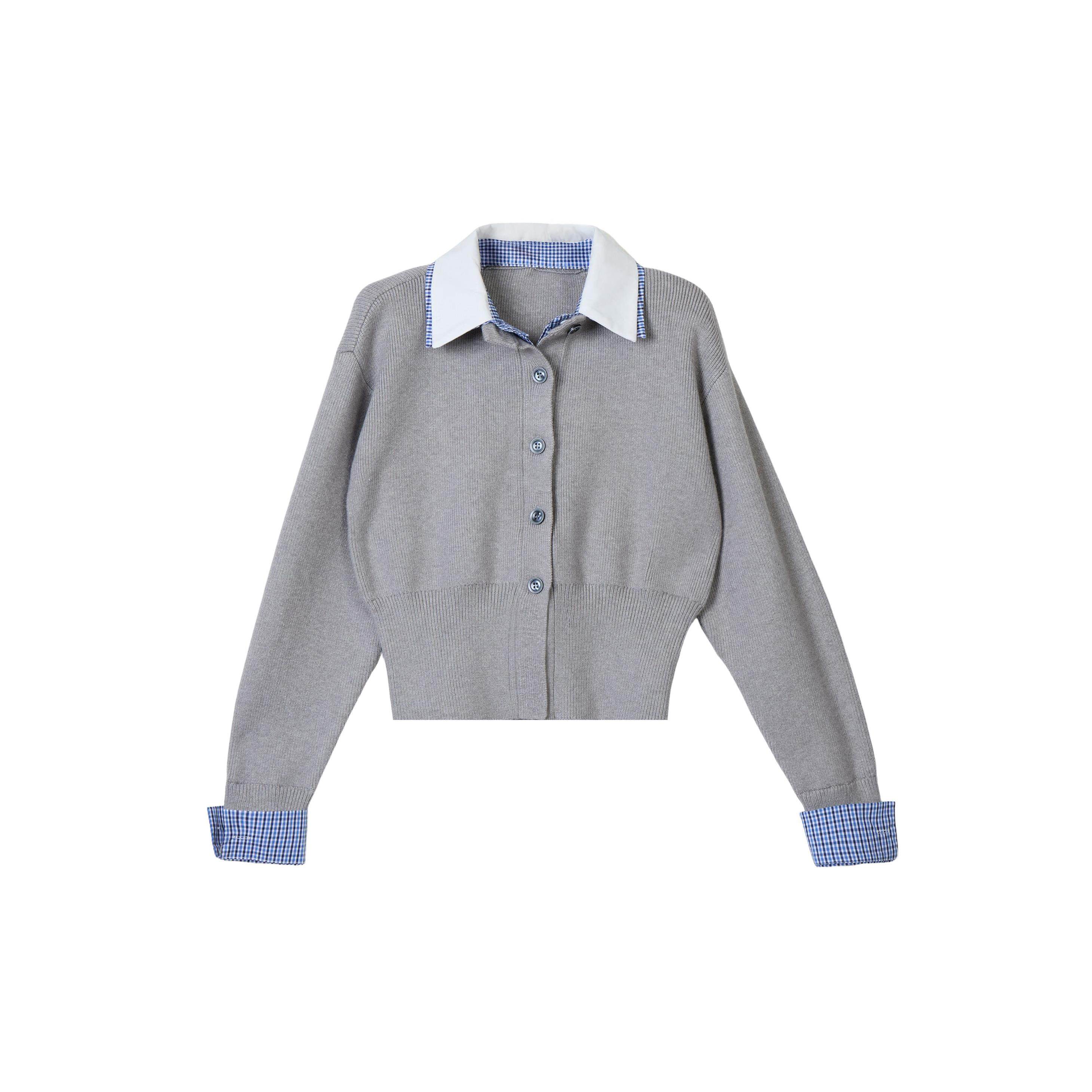 美式灰色polo领假两件长袖针织开衫女秋冬季格子修身短款毛衣上衣