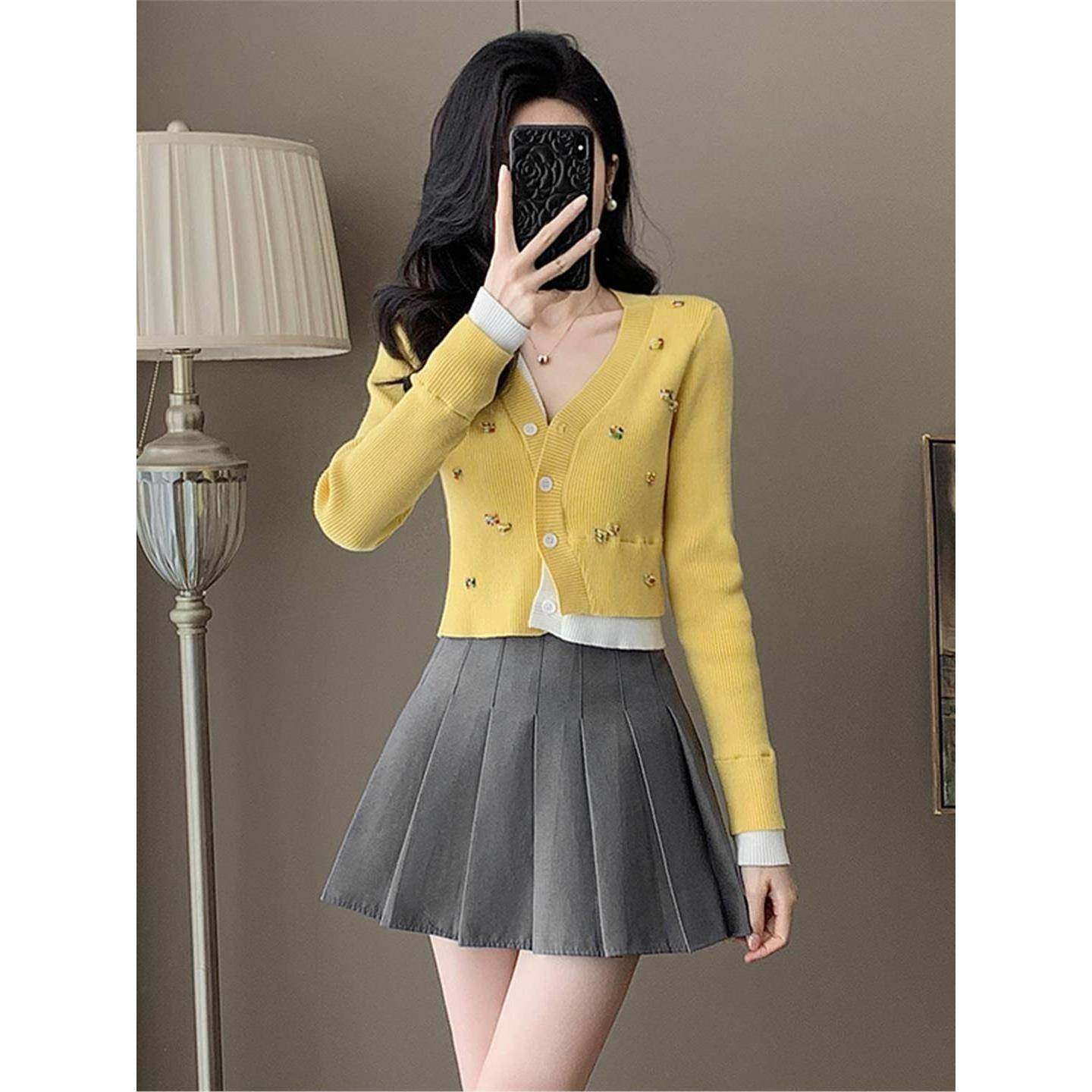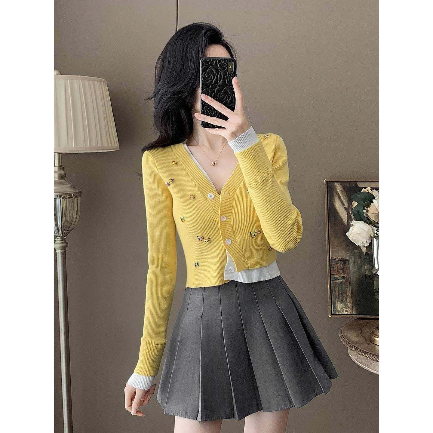 Ocnltiy撞色V领假两件针织衫女士秋季修身气质短版开襟外套设计感