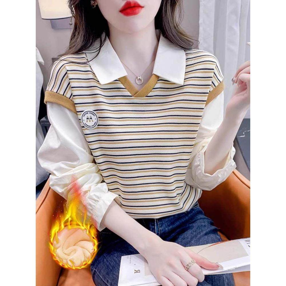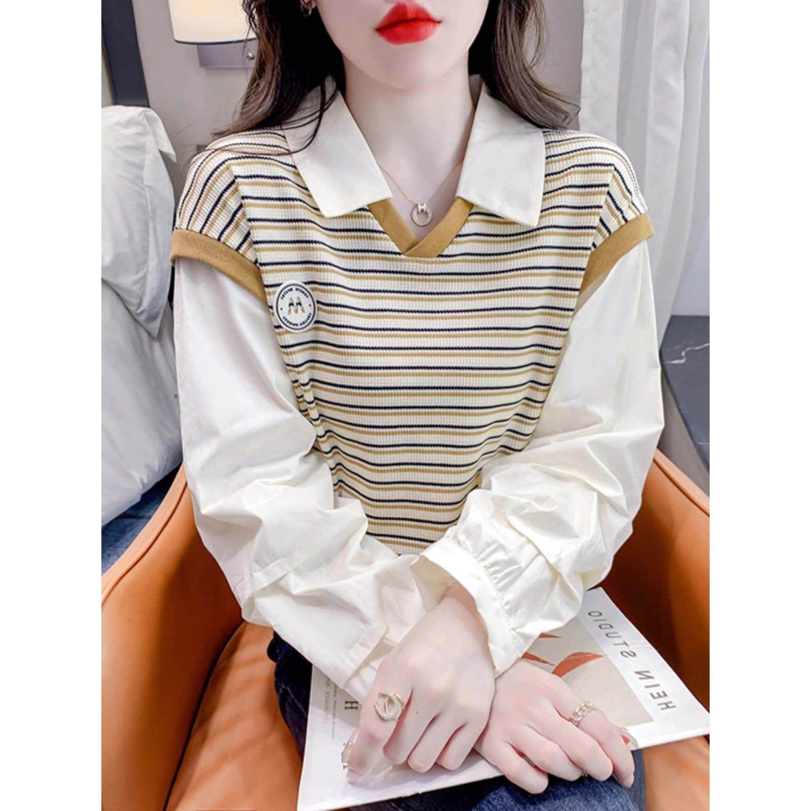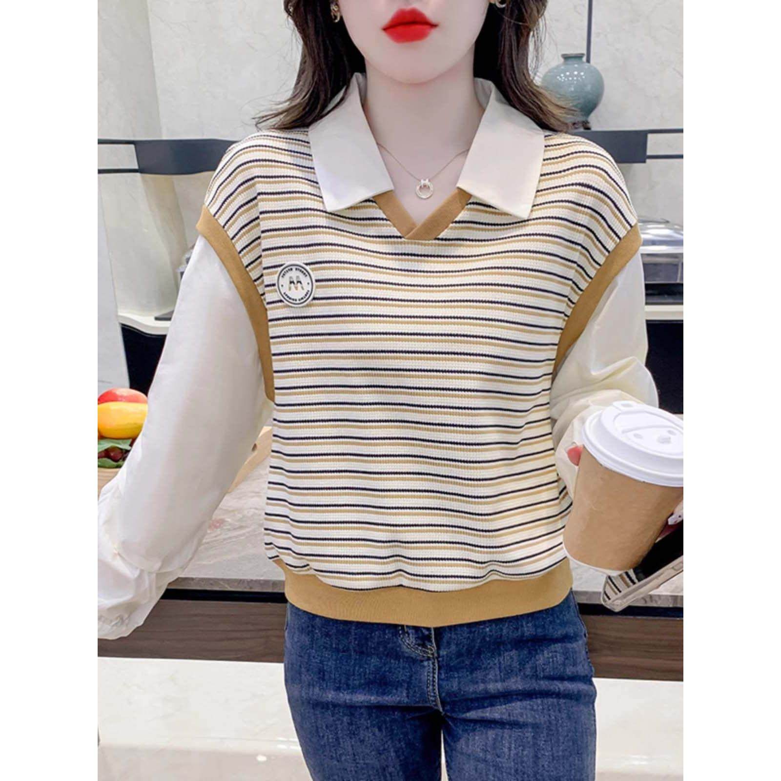 首页> 女装> polo领针织衫女士春秋薄款2025新款假两件条纹毛衣打底衫内搭上衣