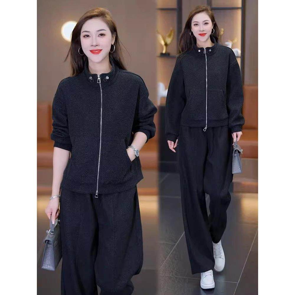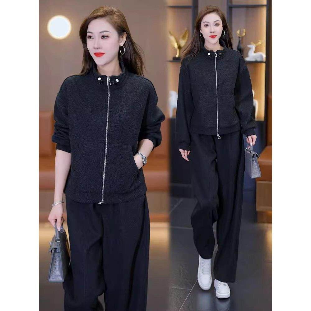 香港代购时尚休闲套装女秋季新款时髦开衫短外套阔腿裤加厚两件套
