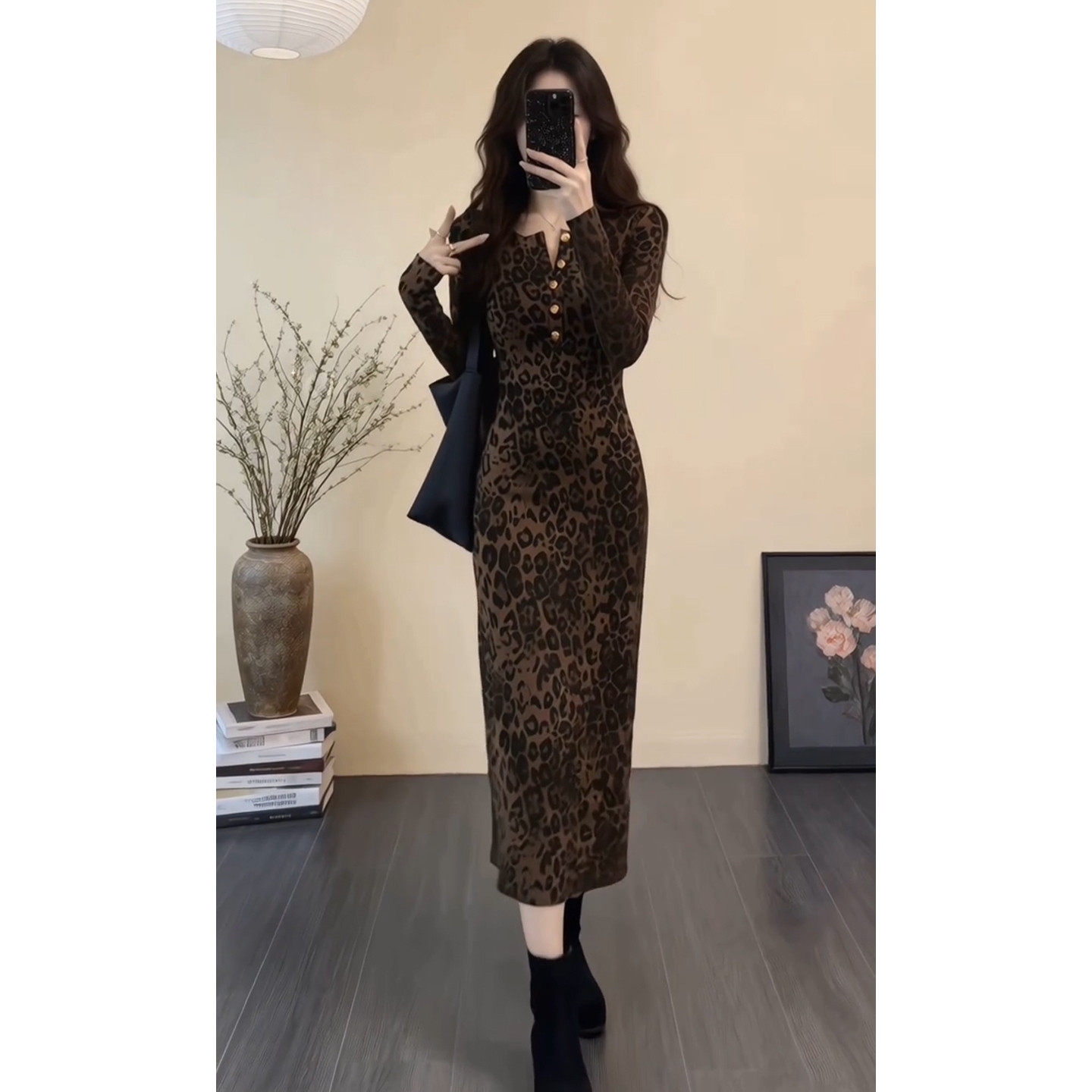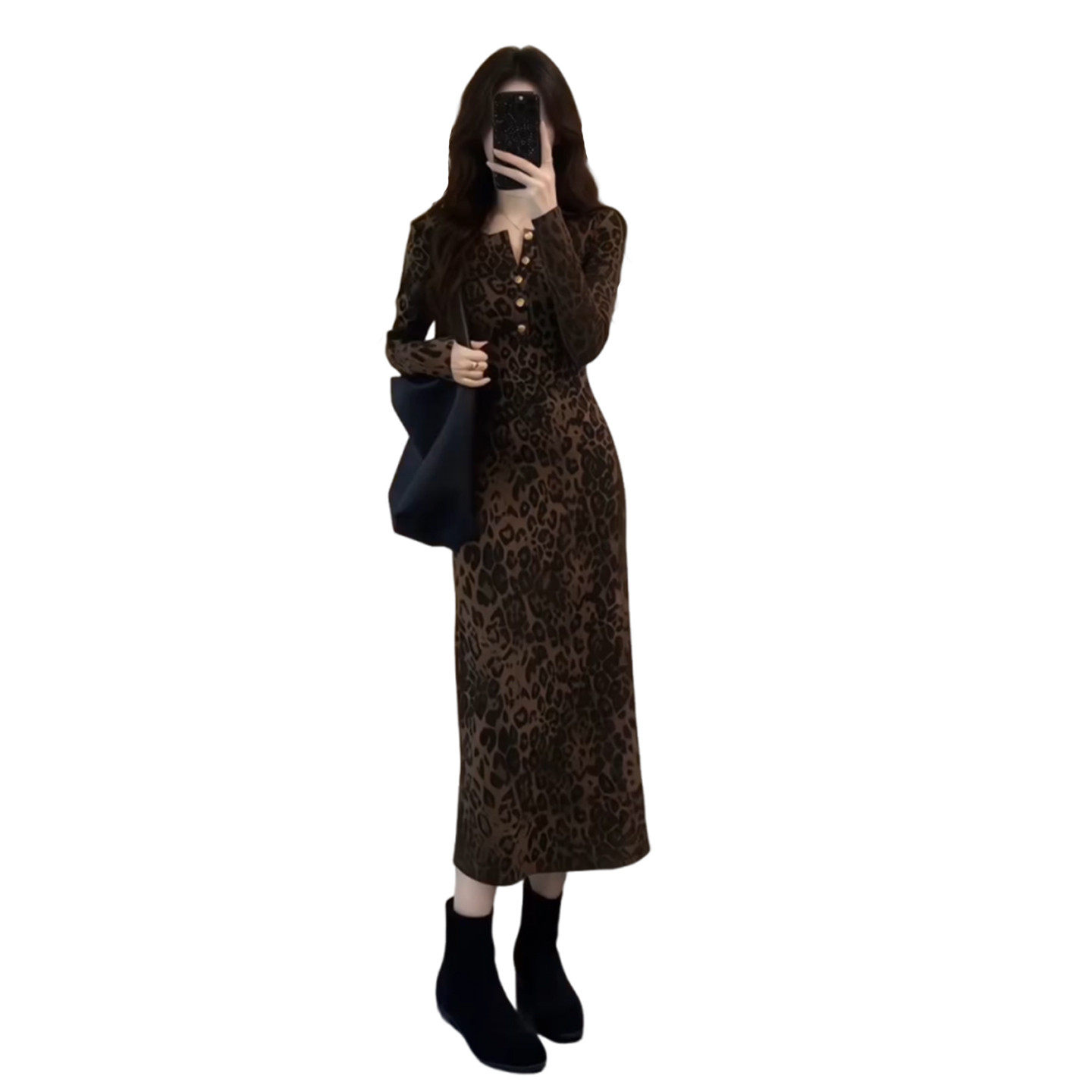 法式复古长袖豹纹洋装子女秋冬2026新款高级感气质收腰显瘦长裙