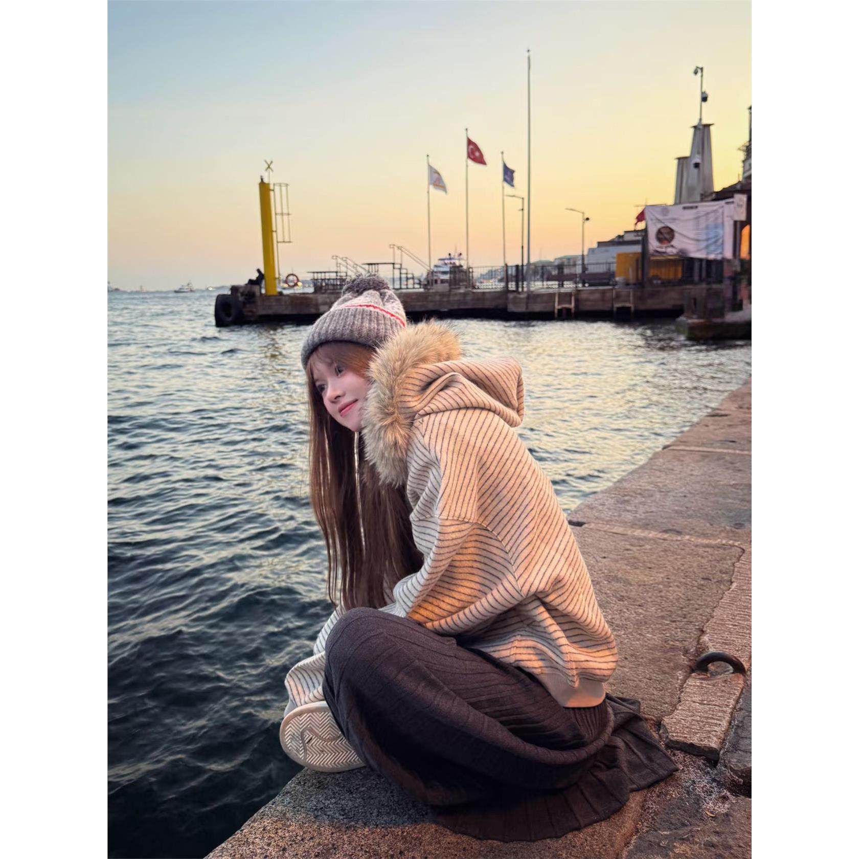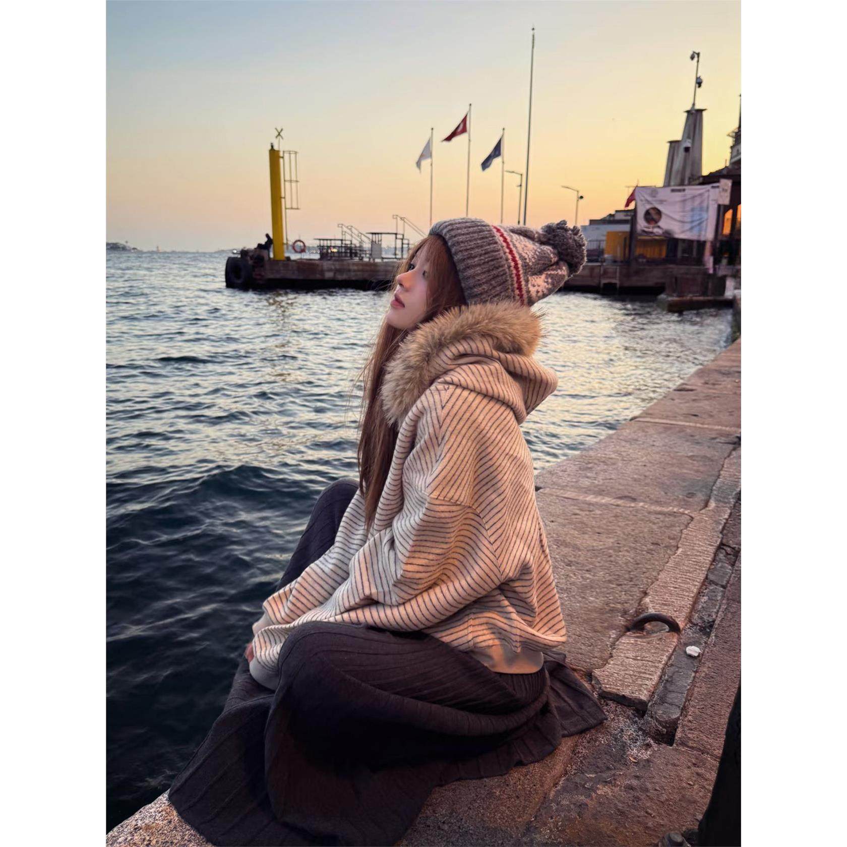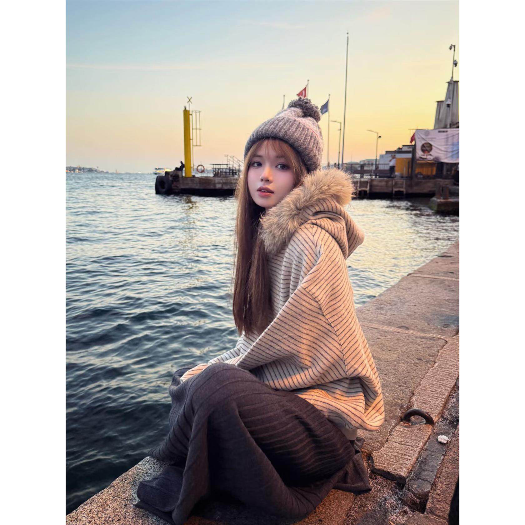 韩系ins早秋穿搭连帽卫衣女2025秋冬加绒可拆卸毛领帽衫开衫外套