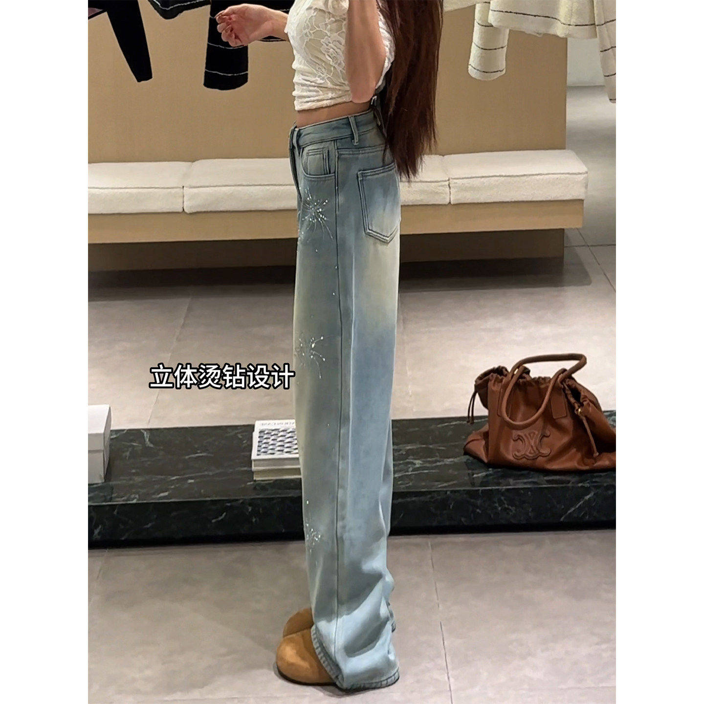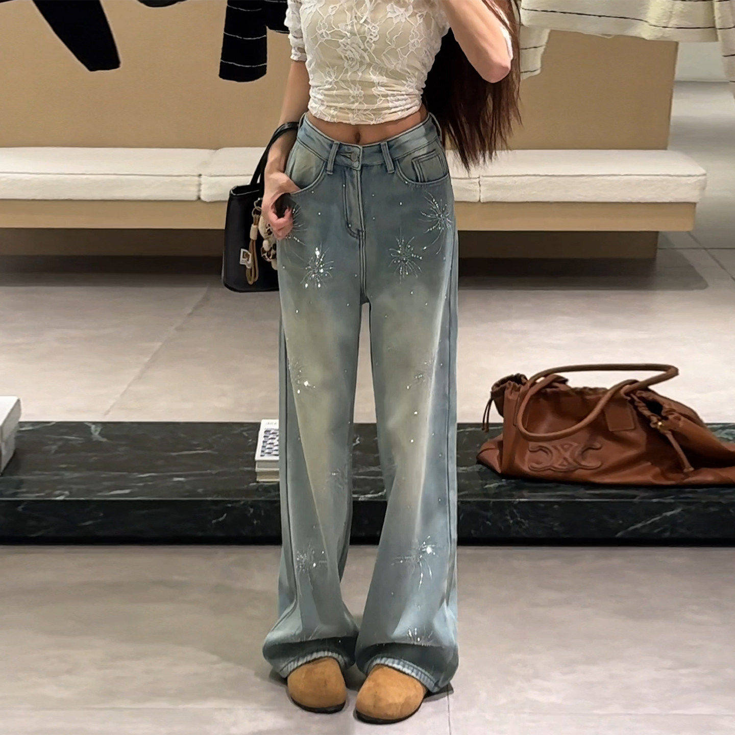 高级感烟花闪钻阔腿牛仔裤女2026冬季新款宽松显瘦直筒拖地加绒裤