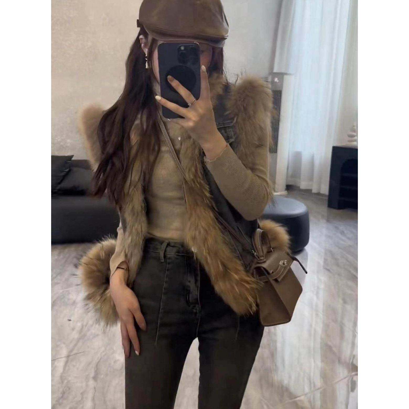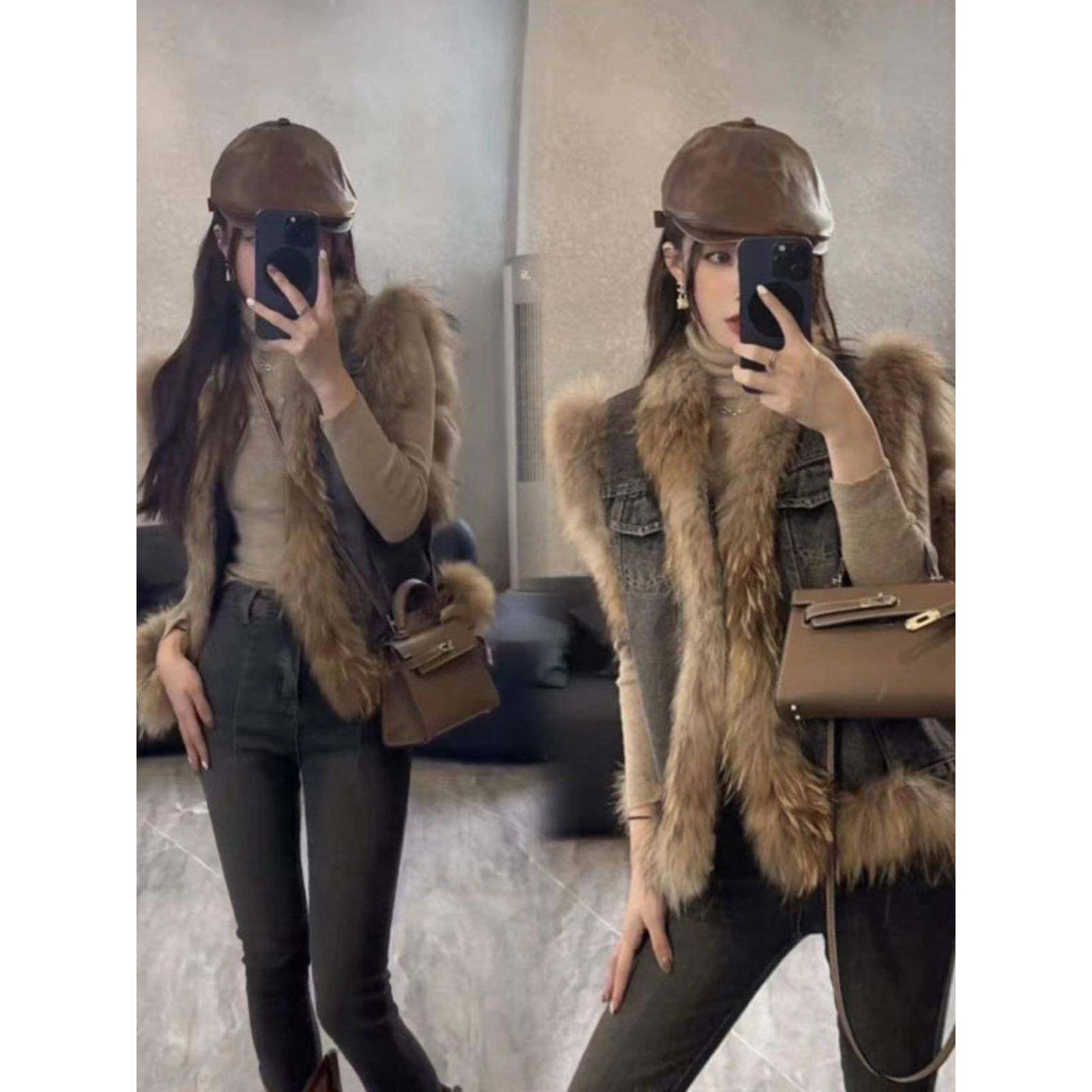韩国2025冬新款时尚牛仔拼接环保皮草外套女加棉保暖洋气宽松马甲