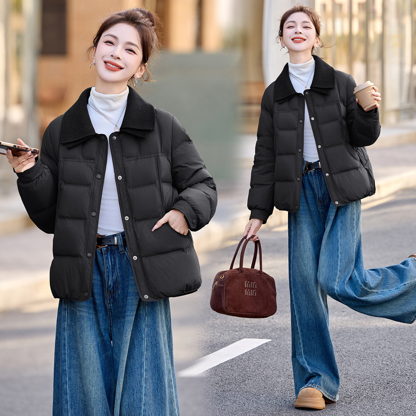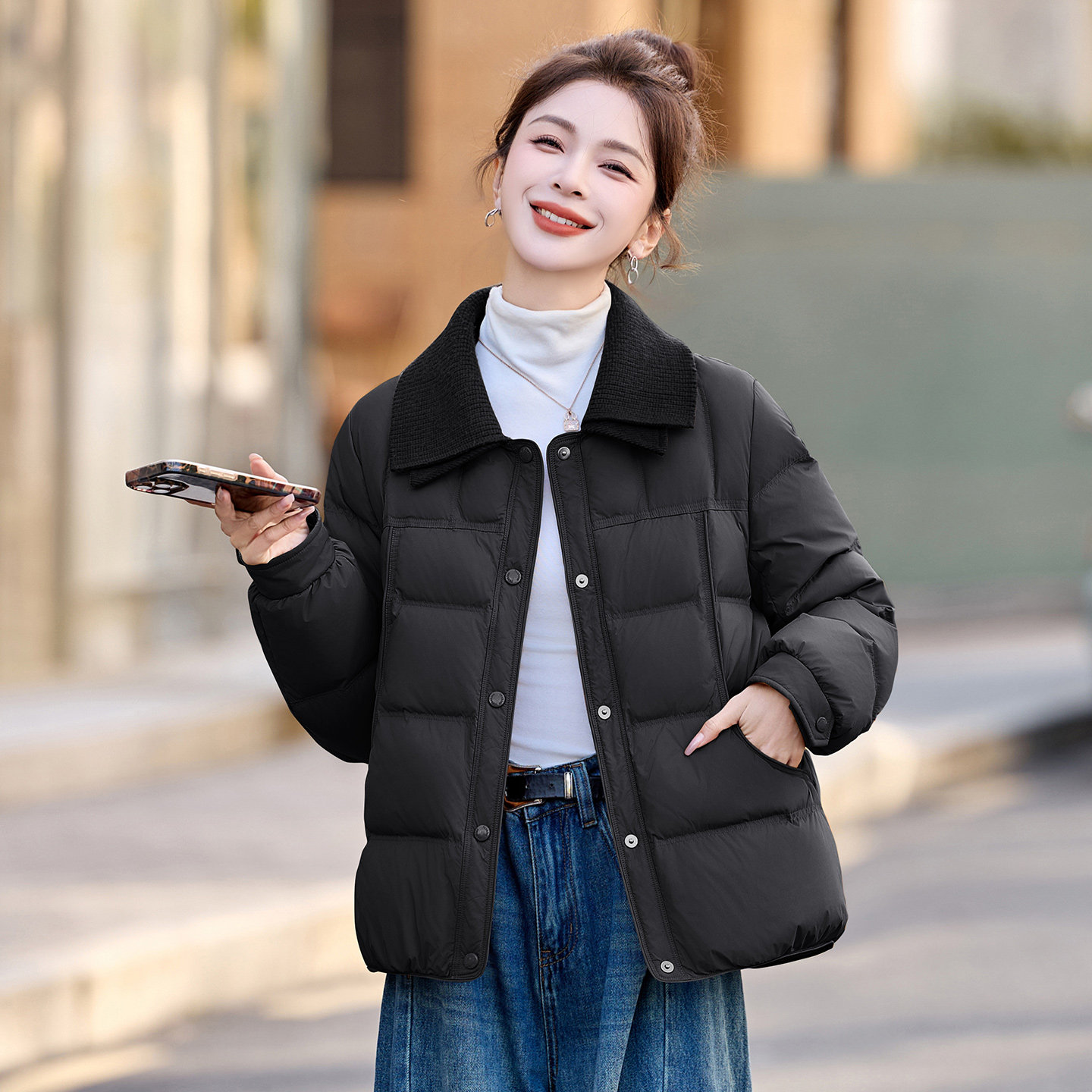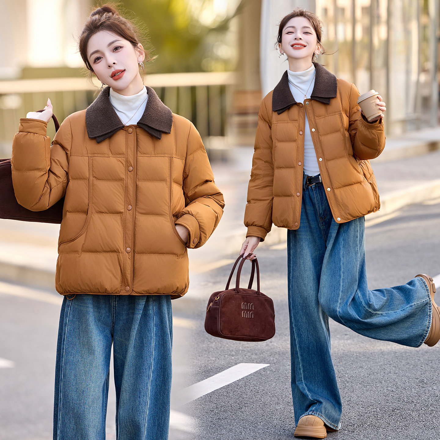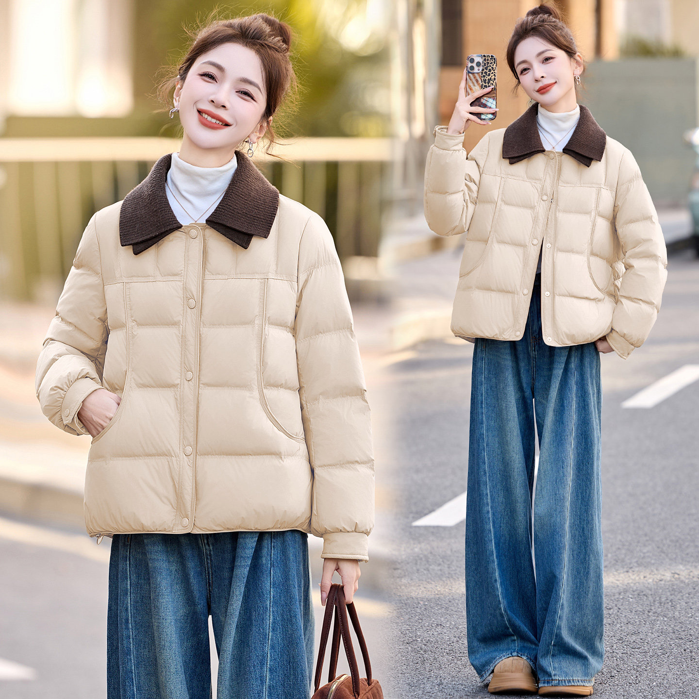 ERAL艾莱依短款羽绒服女白鸭绒冬季翻领宽松时尚洋气高级感外套