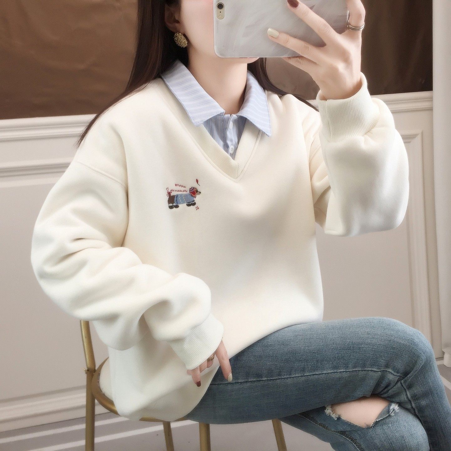 冬季2025新款假两件女士卫衣上衣秋冬装衬衫POLO领加绒厚洋气爆款