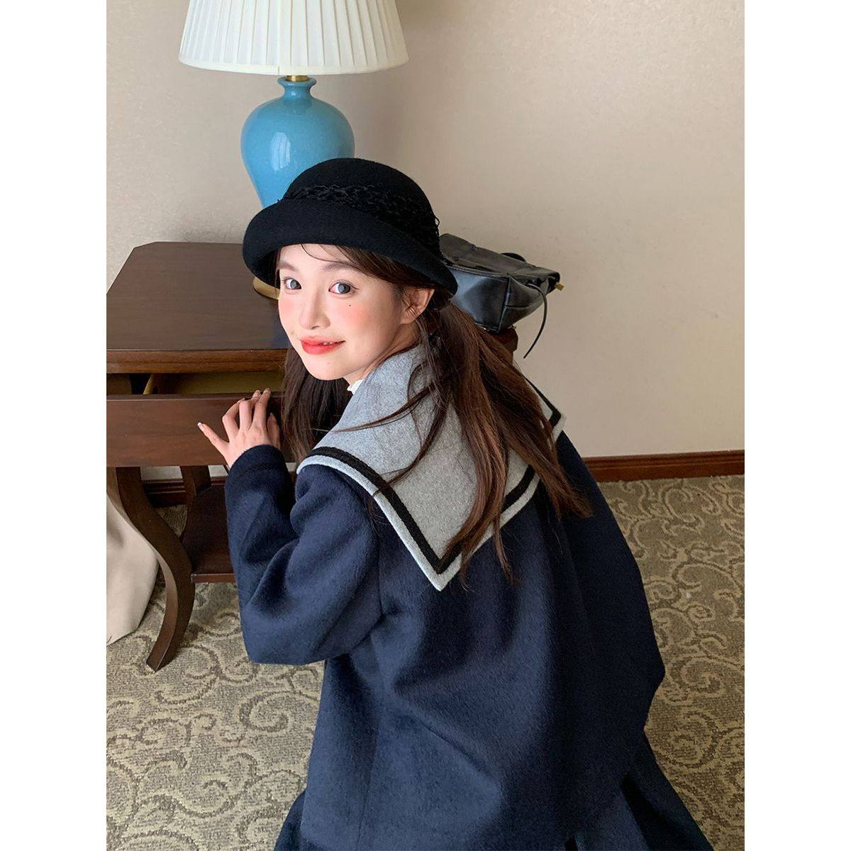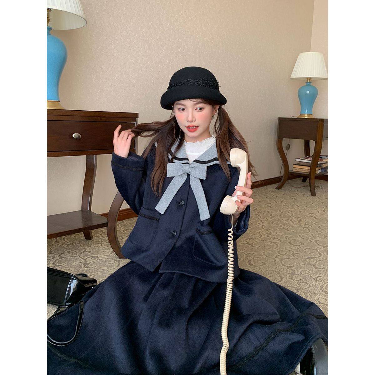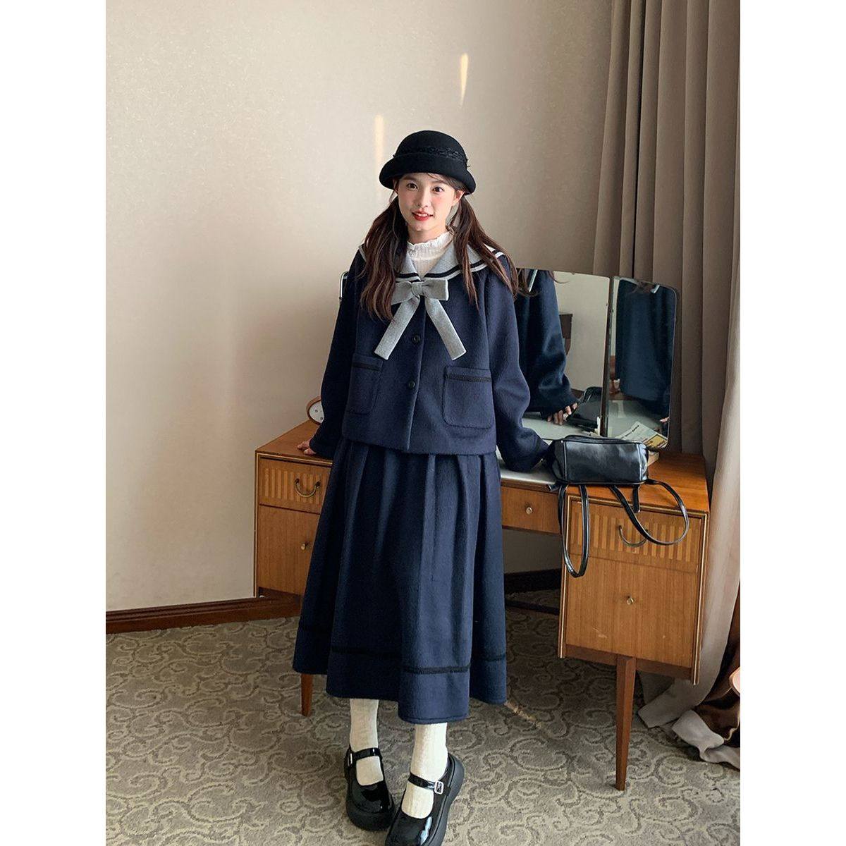 甜美可爱小个子学院风藏青色撞色拼接海军领外套+半身裙两件套女