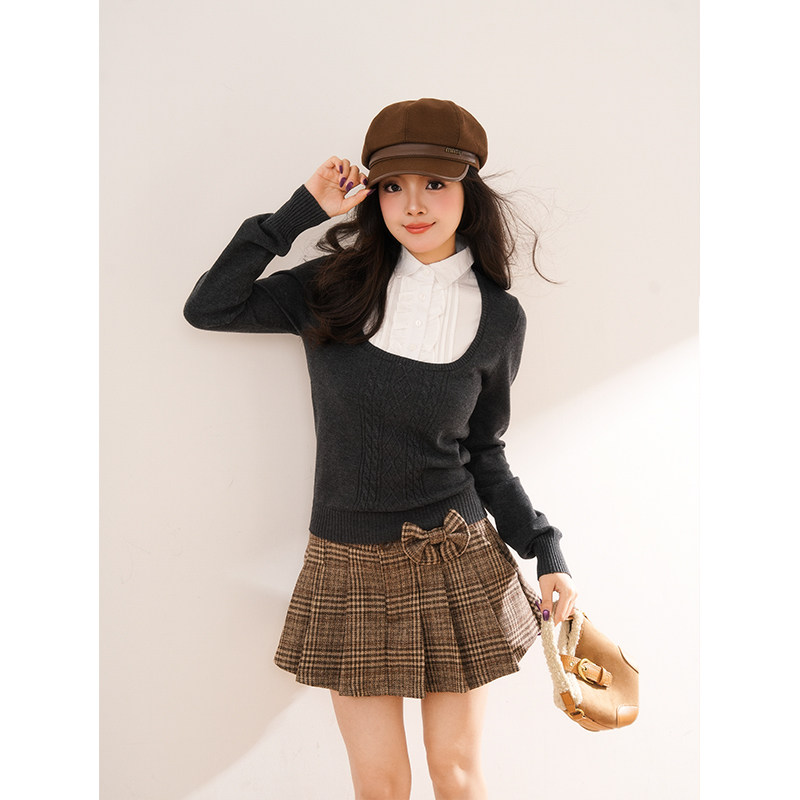 都市环游 拼接假两件修身显瘦针织衬衫+蝴蝶结格纹百褶短裙两件套