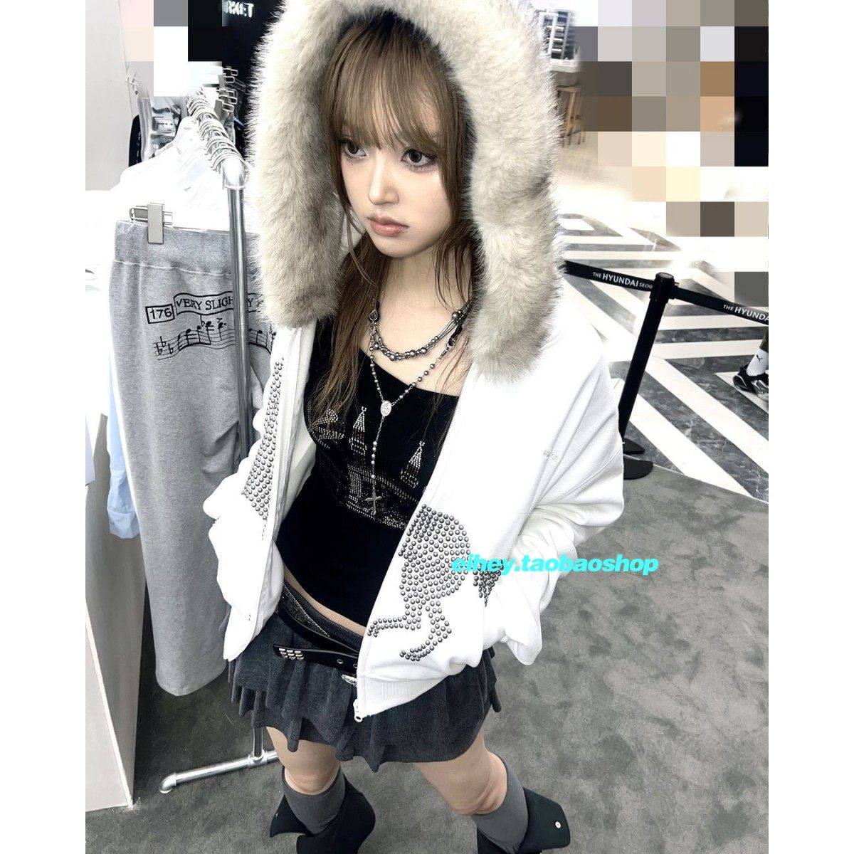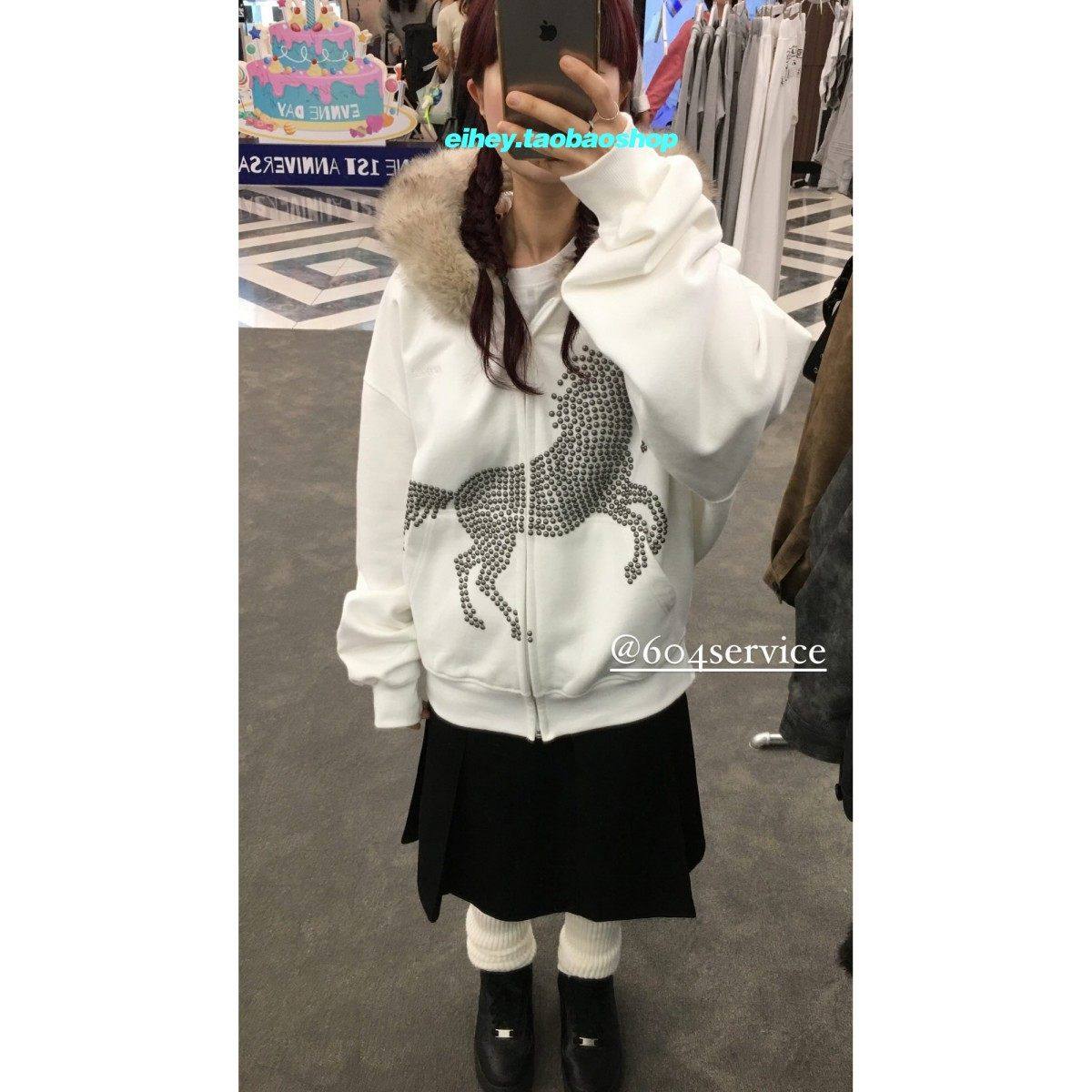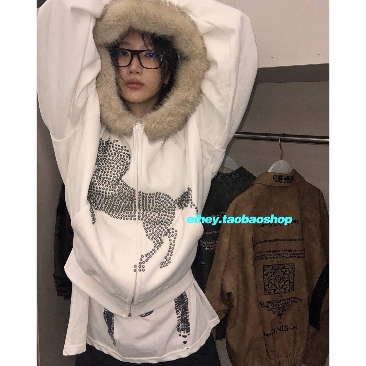 eihey诶嘿加绒毛领卫衣外套女短款美式烫钻设计感连帽开 衫上衣潮