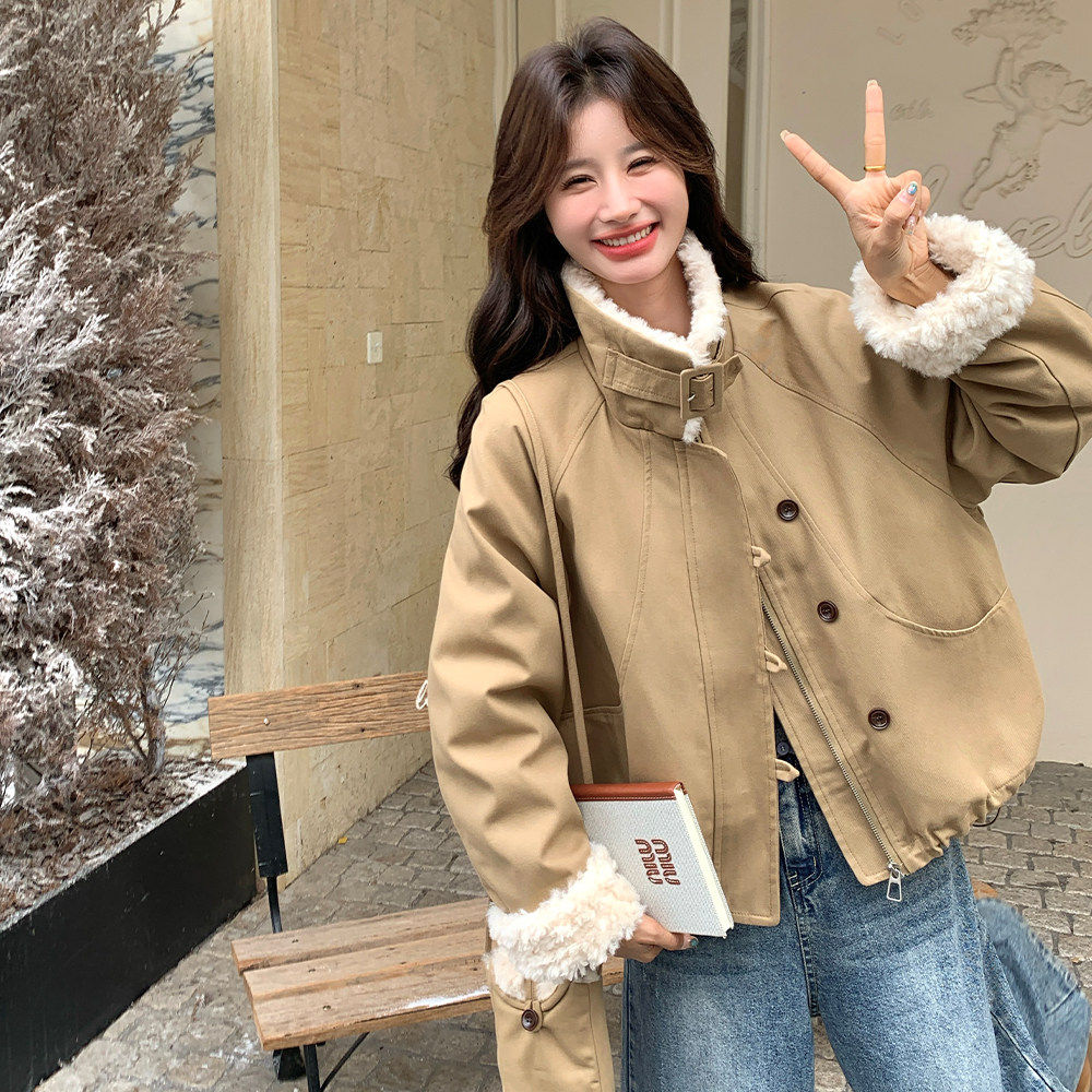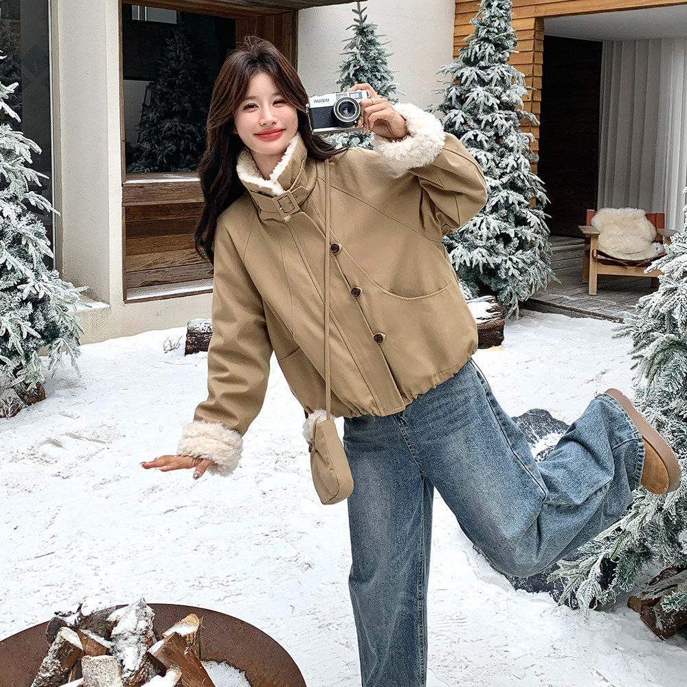 超火好看卡其色羊羔毛领短款派克羽绒服女冬2025超级小众加厚外套