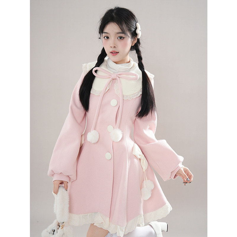 首页> 女装> 秋冬甜美风小个子围巾花边娃娃领毛球系带毛呢外套2025秋冬新款女