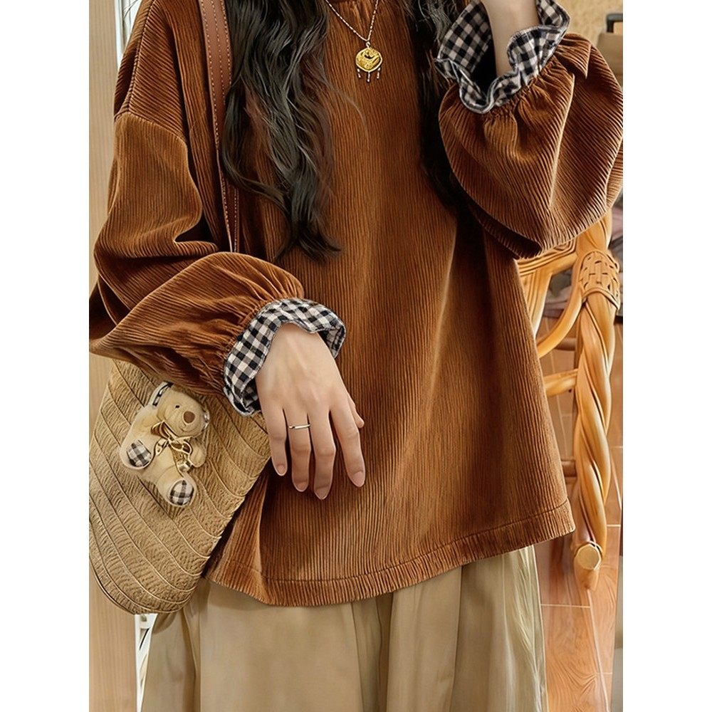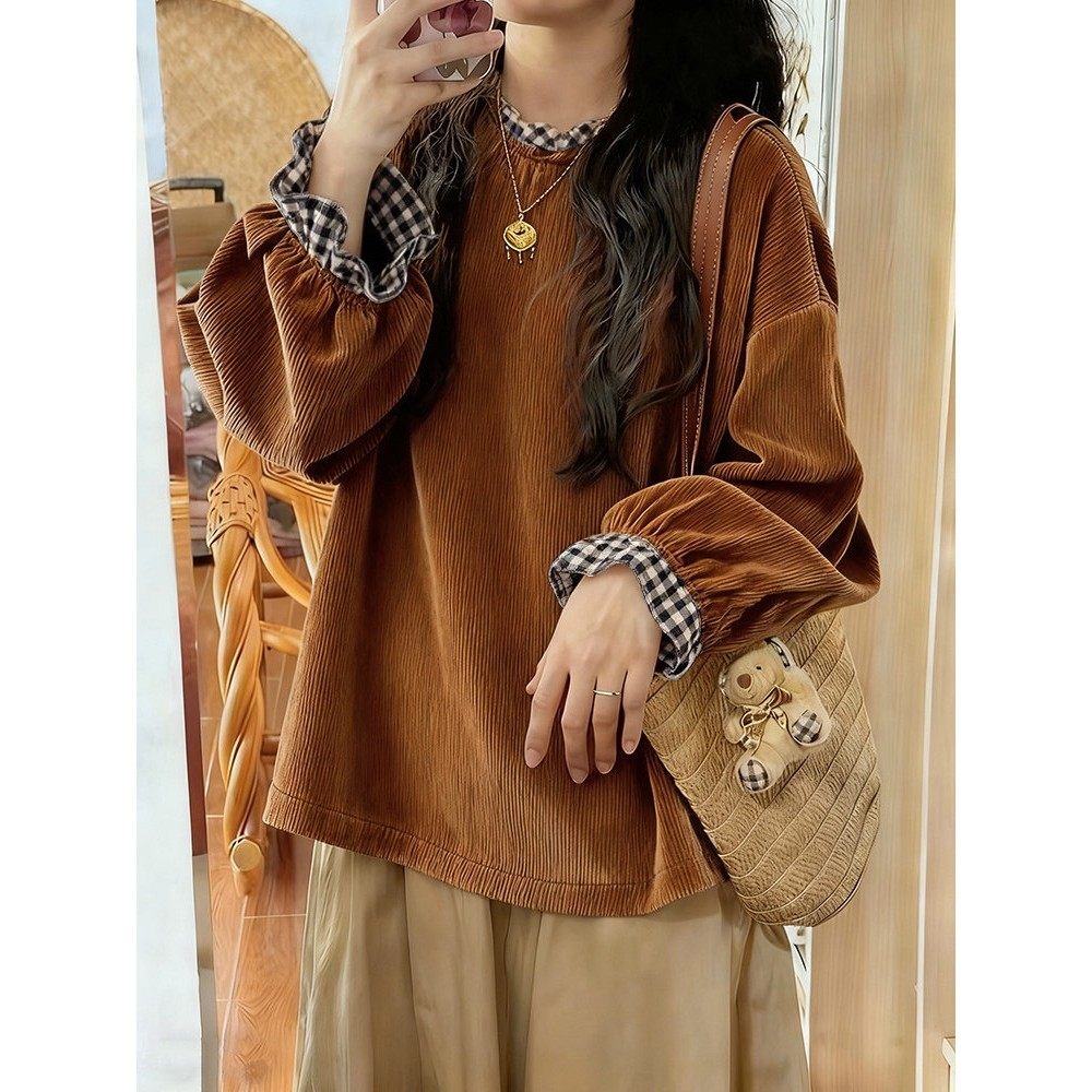 森系覆古棕色灯芯绒格子喇叭袖拼接衬衫独特漂亮新款小衫2025秋季