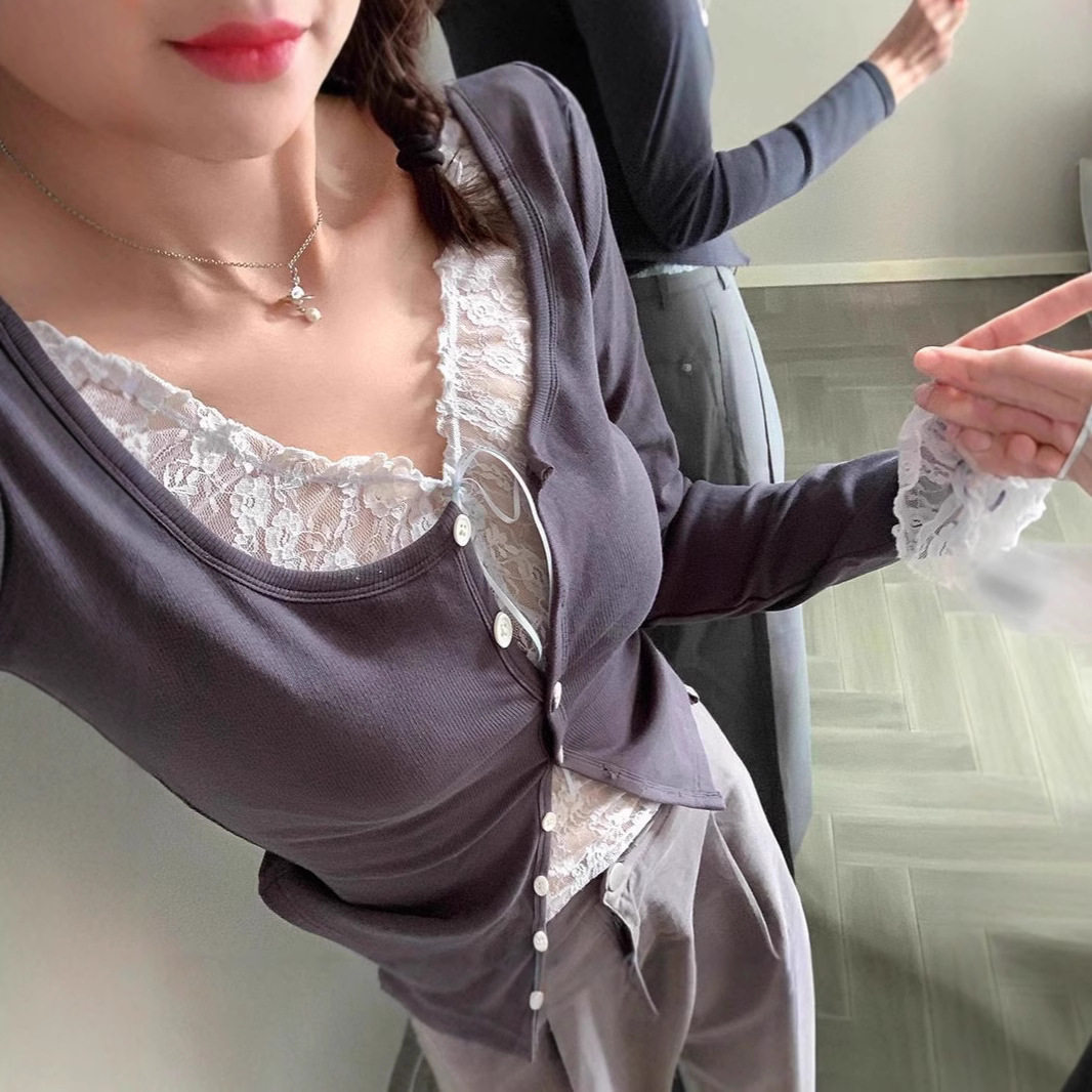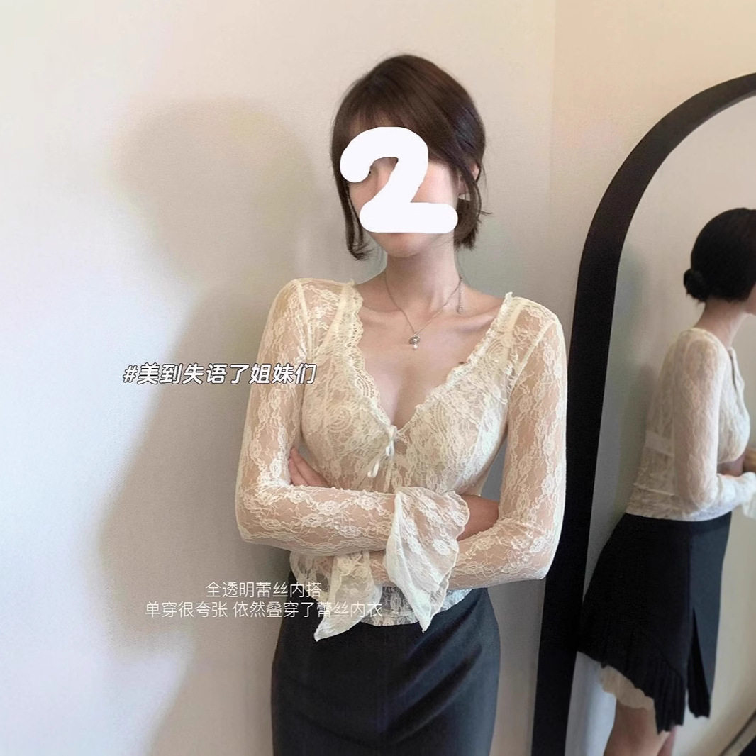 镂空蕾丝打底衫女皮草内搭秋冬款今年流行漂亮小衫V领喇叭袖上衣