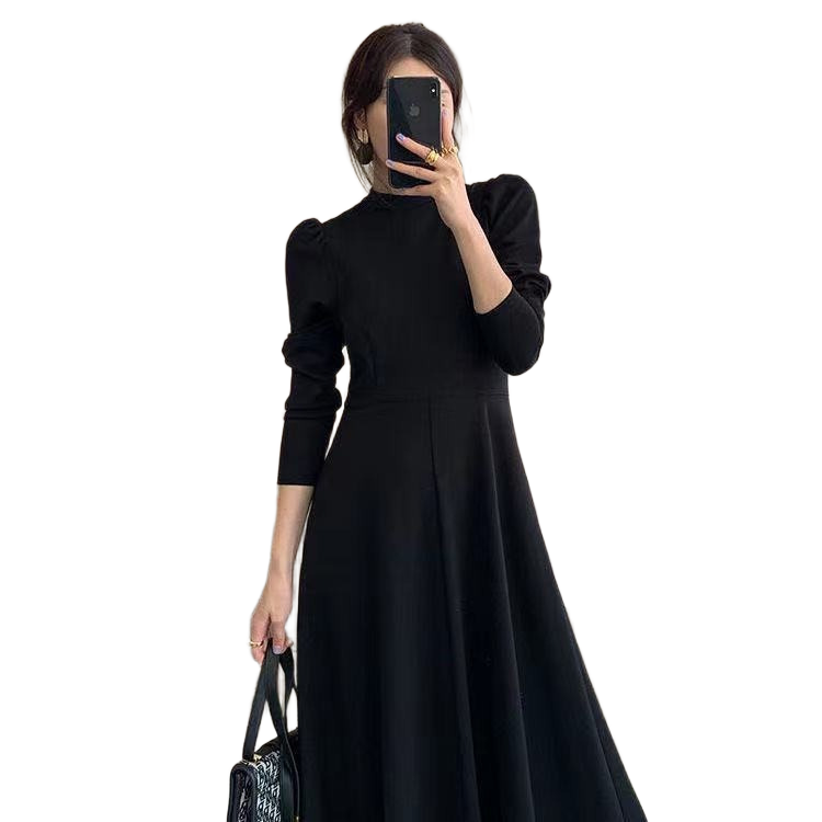 黑色长袖连衣裙春秋季新款韩版收腰显瘦网红大摆裙子