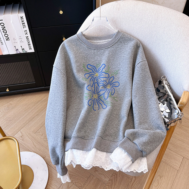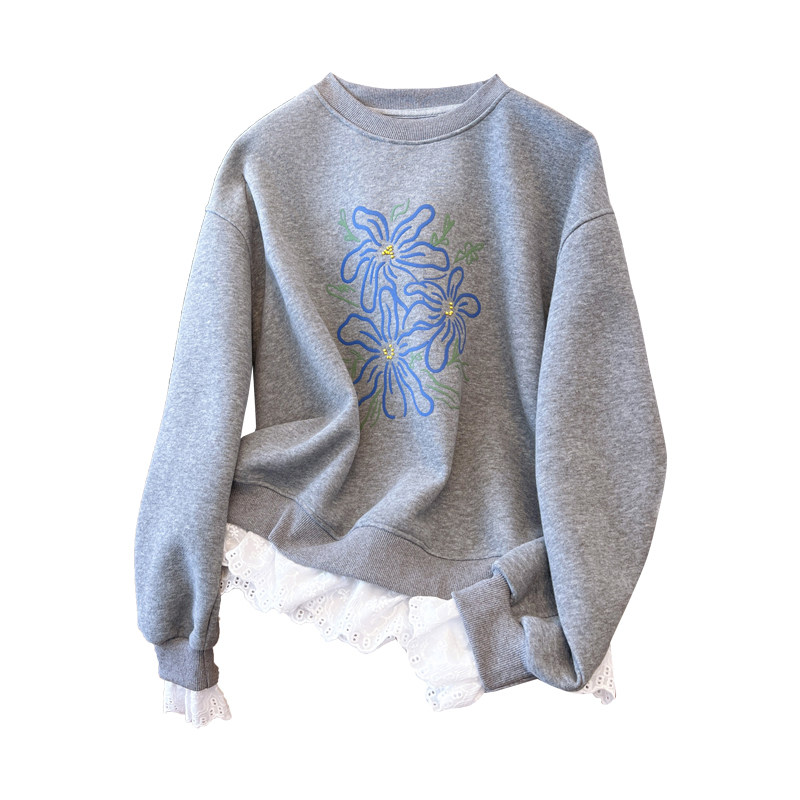 现货 韩系秋款甜美印花订珠宽松休闲显瘦花边拼接假两件卫衣