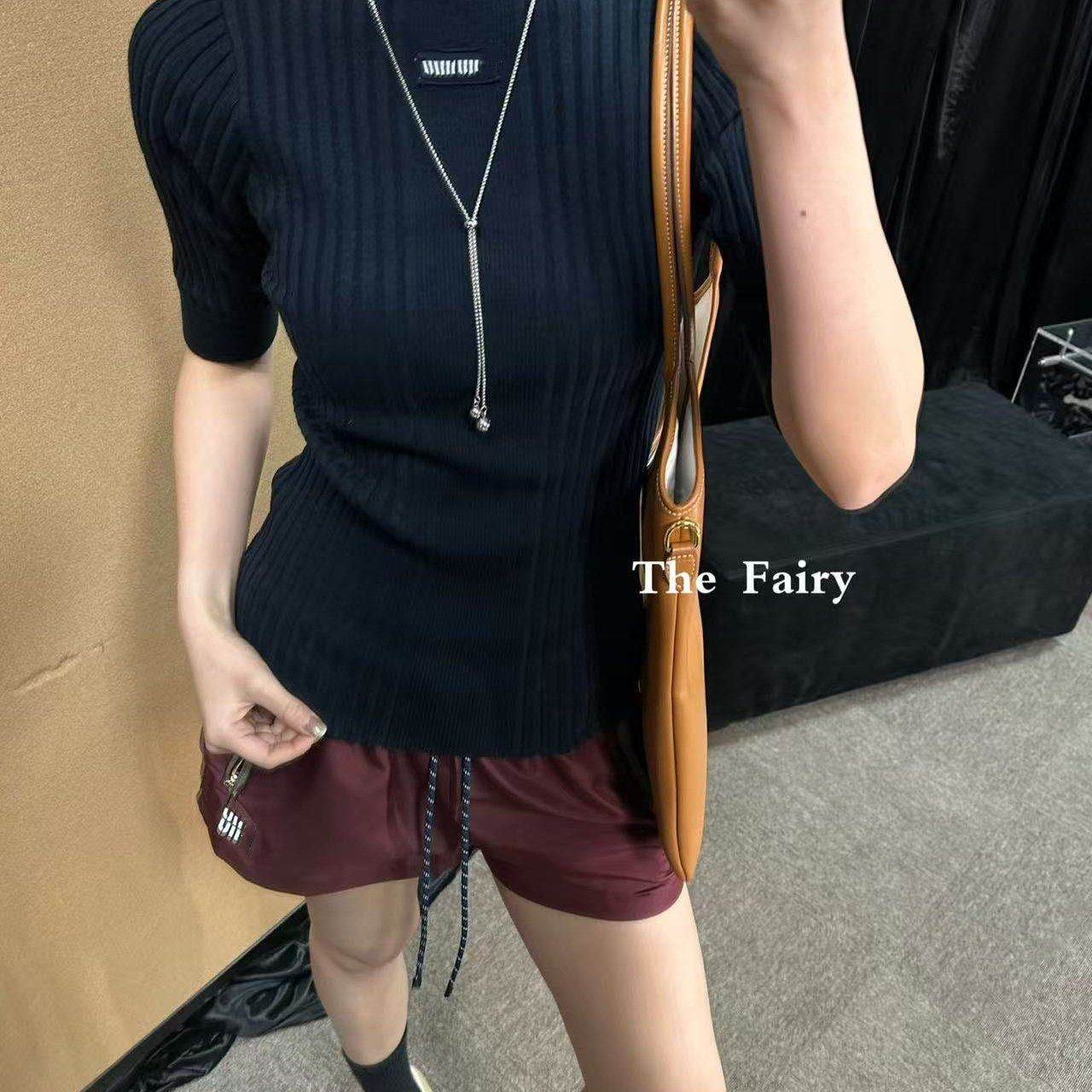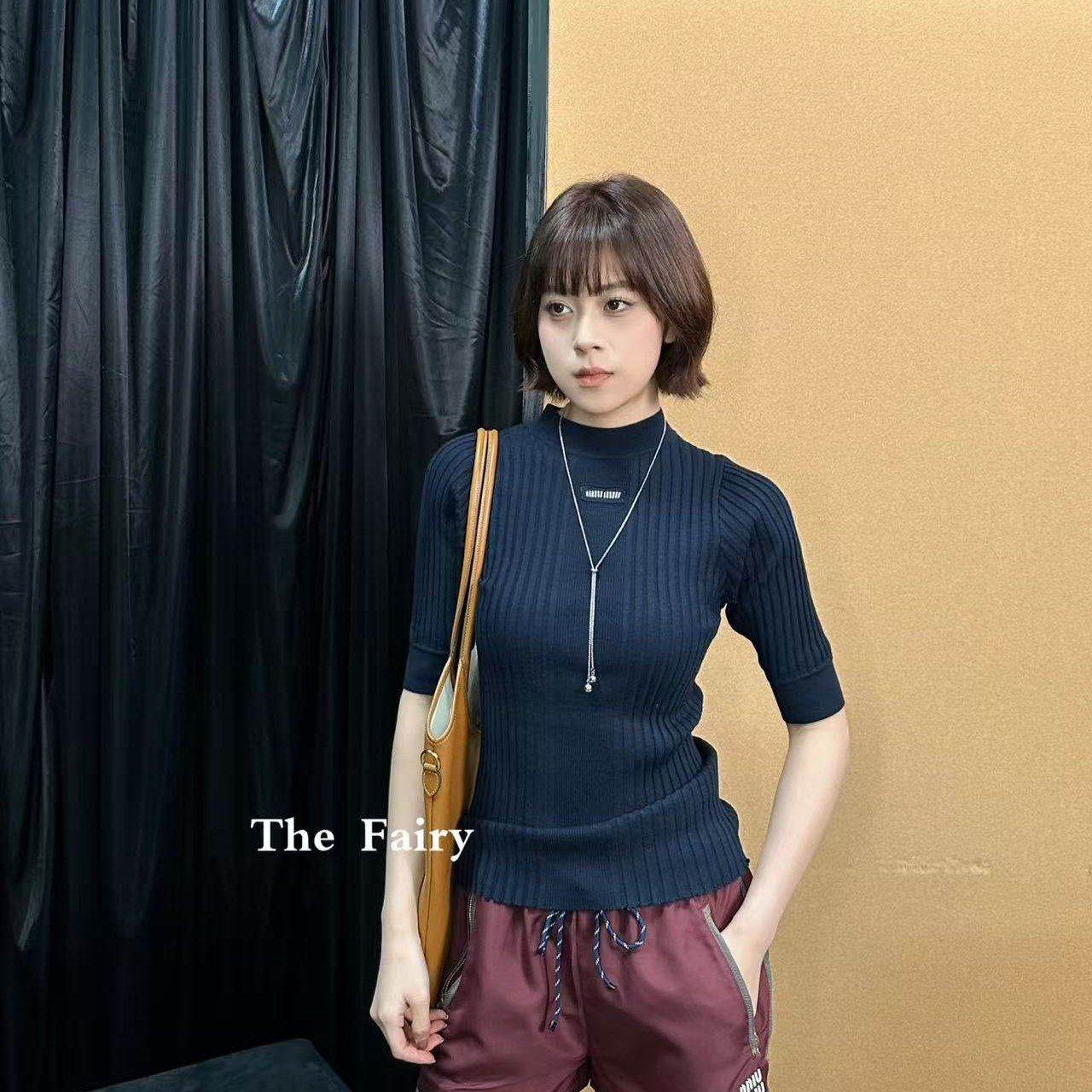 好漂亮蓝色翻领半袖针织螺纹打底衫女2026年早春新款短上衣时尚潮