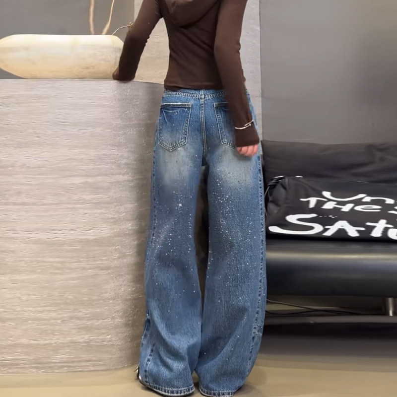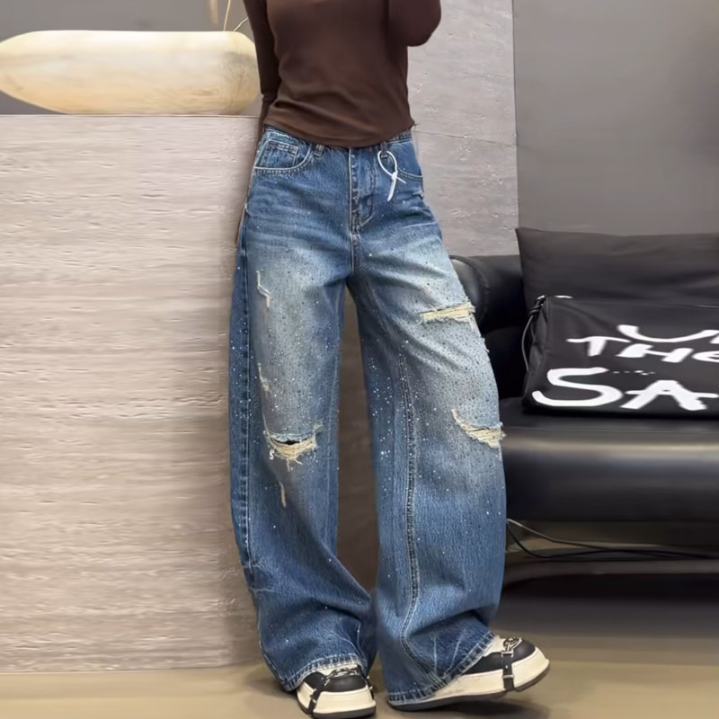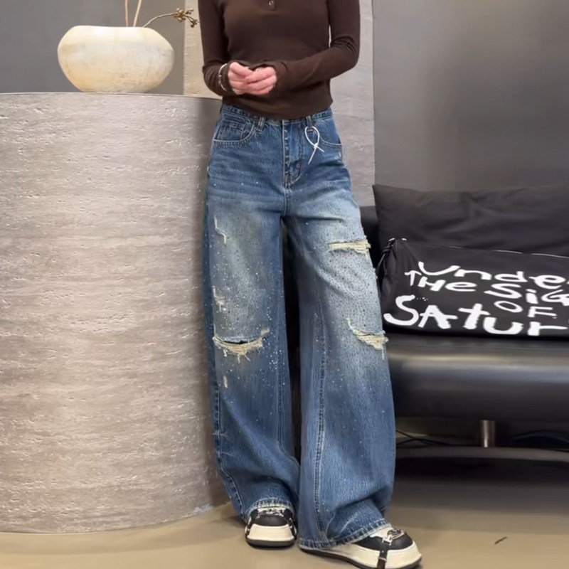 时尚早春2026欧货重工烫钻高腰做旧破洞设计感宽松阔腿牛仔长裤