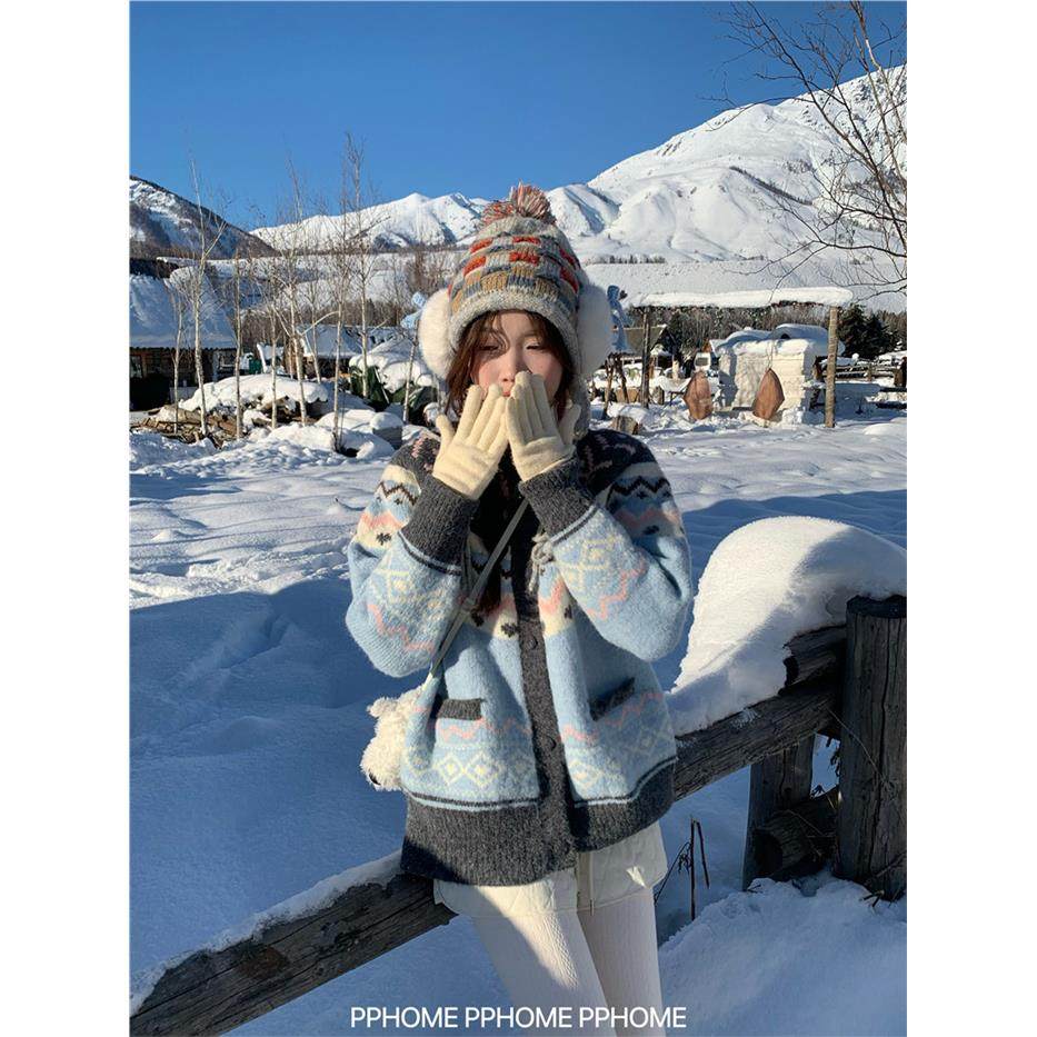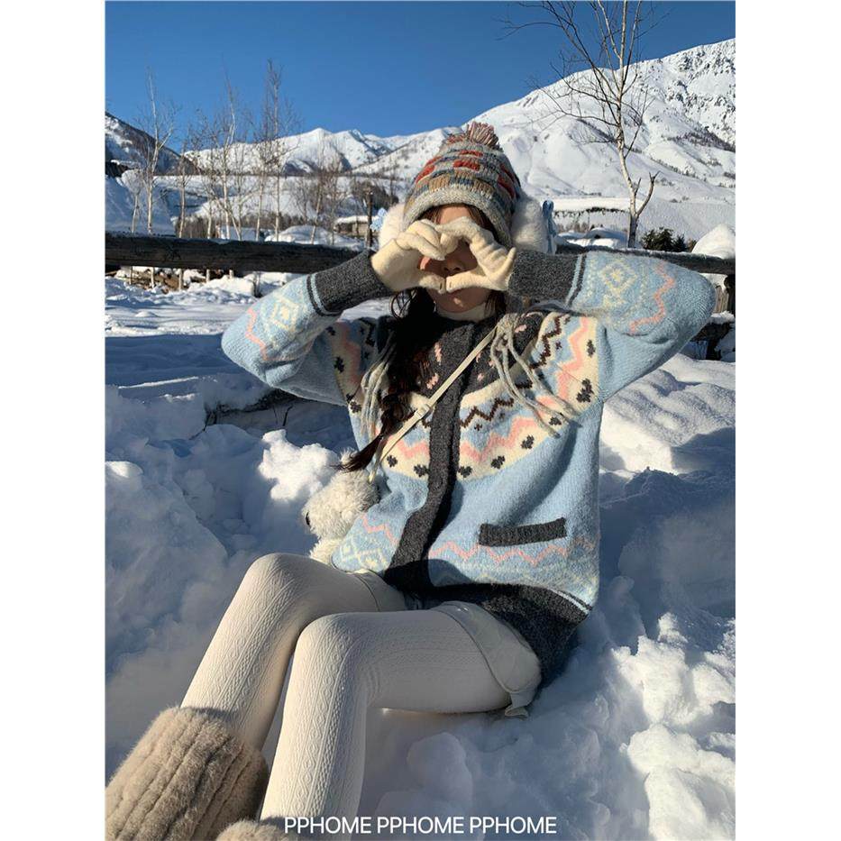 PPHOME自制~冬日初恋 粉蓝费尔岛毛衣外套冬季重工加厚宽松开衫女