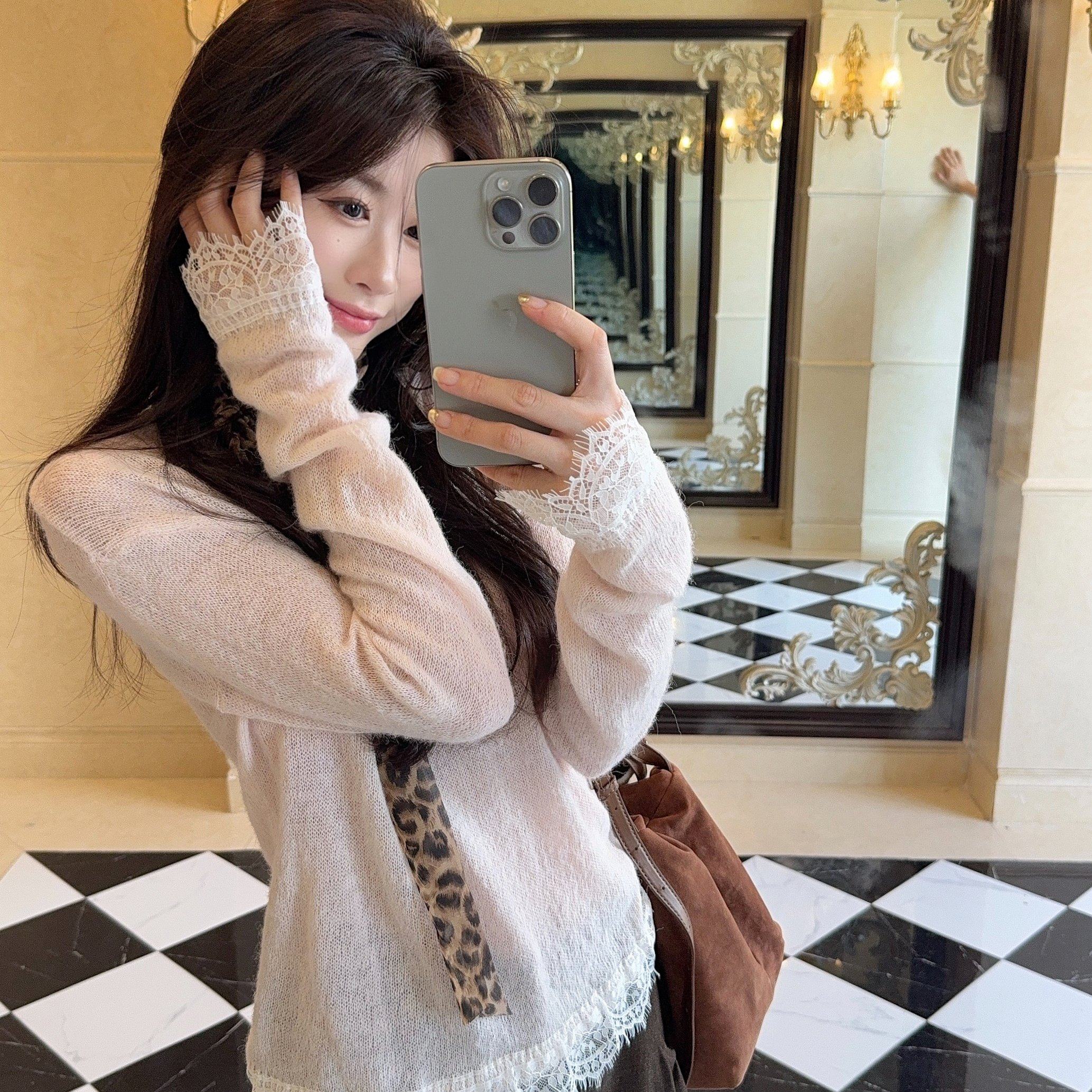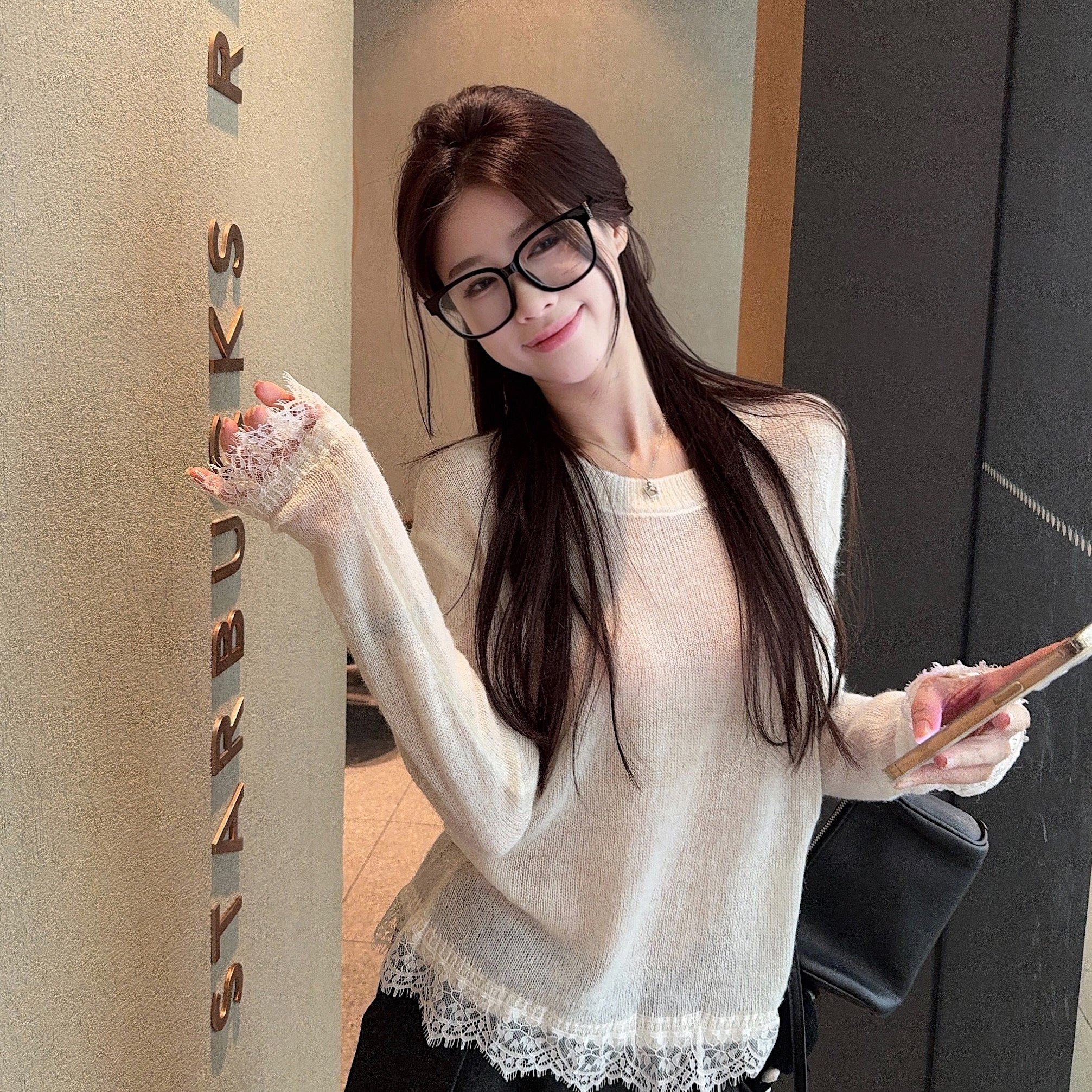 实拍 韩系丝光马海毛拼接蕾丝圆领内搭针织衫
