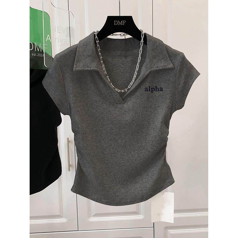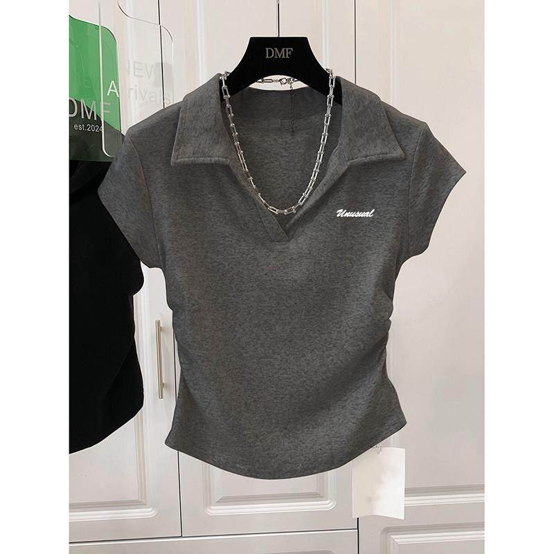 翻领无扣正肩T恤polo领衫女深灰色纯棉短袖V领上衣短款修身设计感
