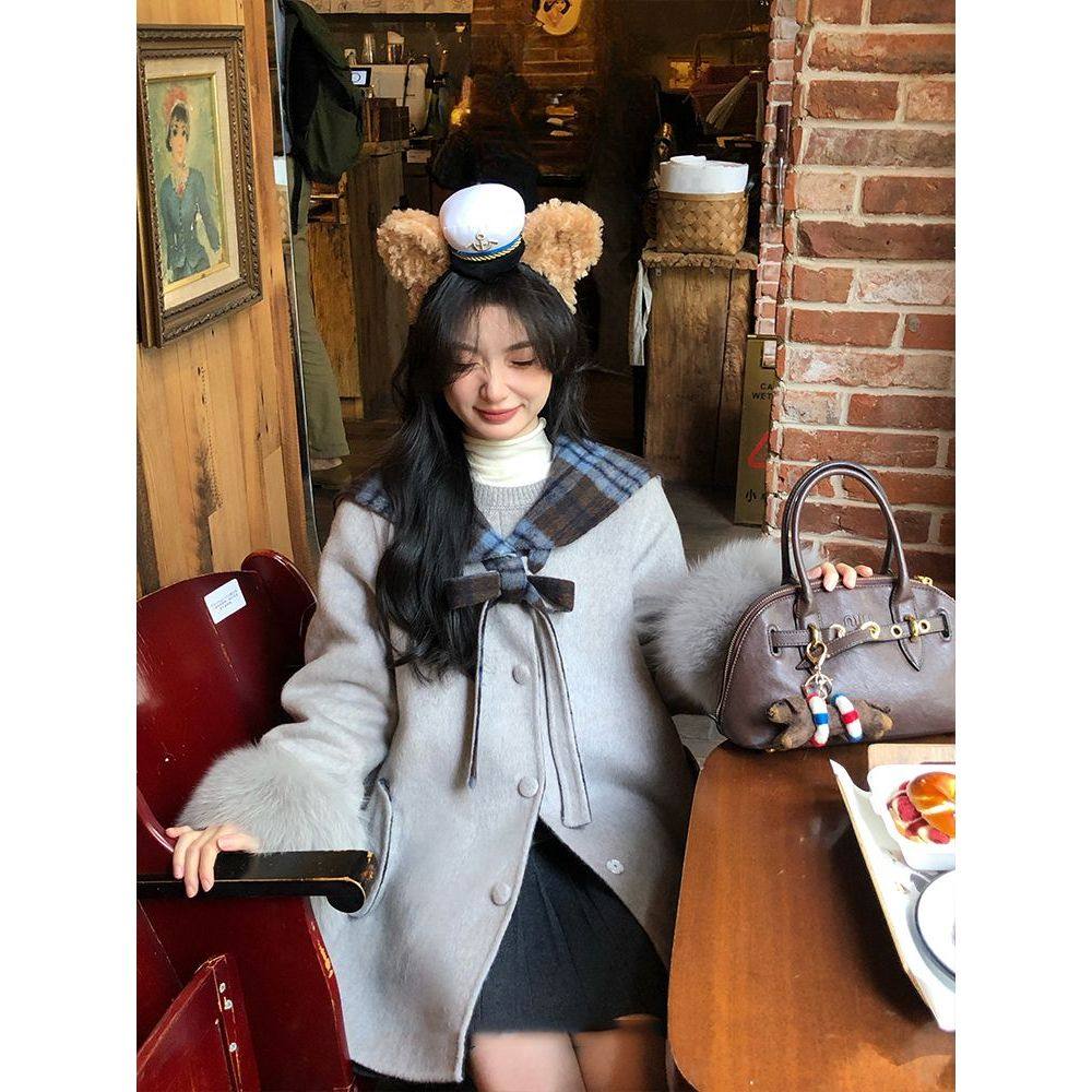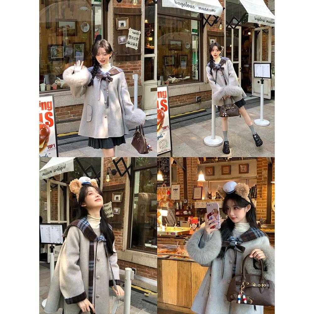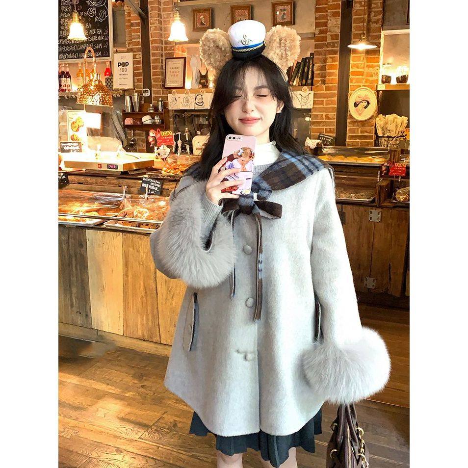 航海艺术家/韩系格子大衣春秋新款毛毛袖海军领气质夹棉毛呢外套